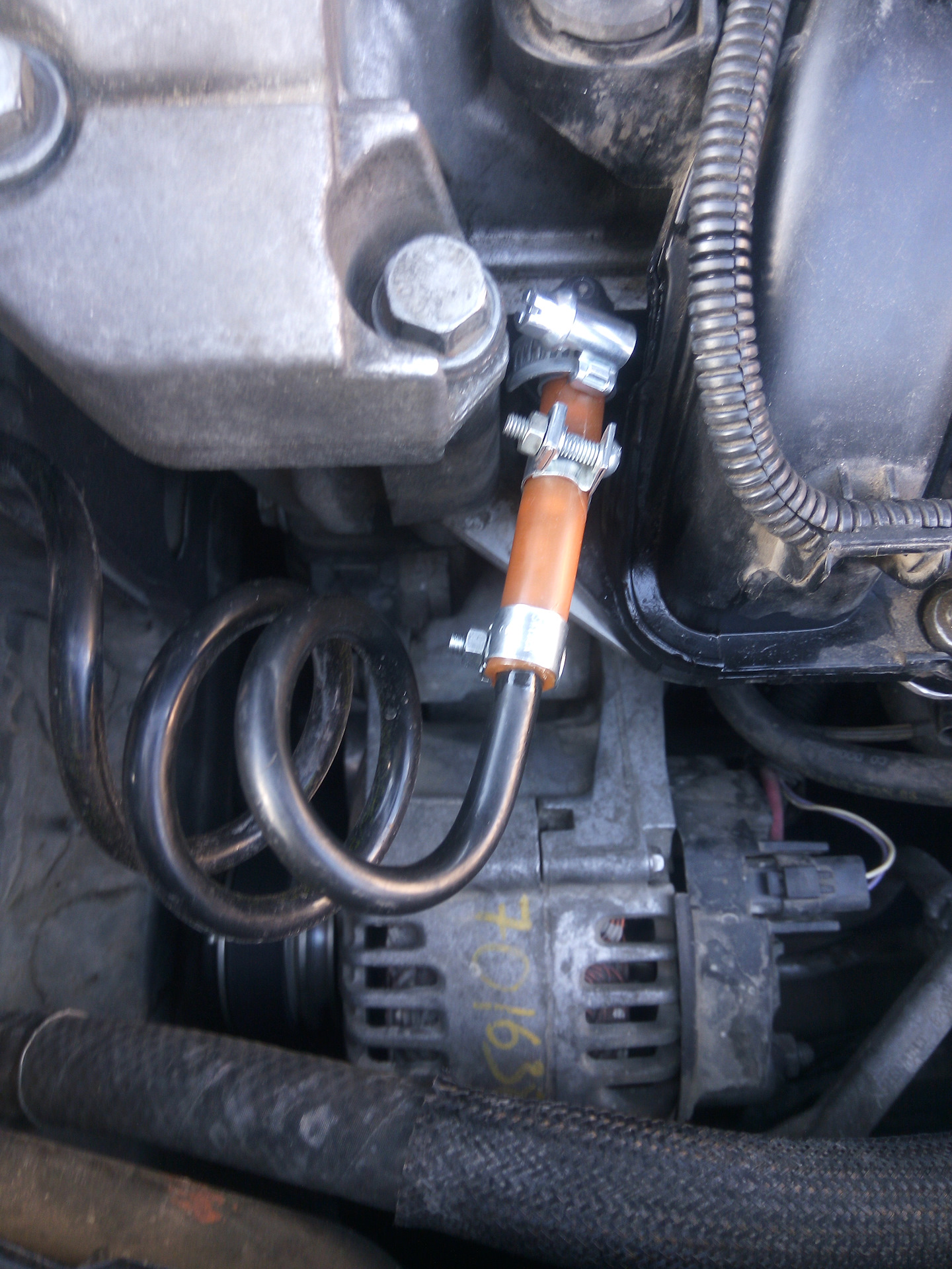 и пошел пытать счастья в попытке насадить трубку на штуцер под капотом. Безуспешно… Пошёл искать подходящий по диаметру кусок трубки, чтобы с его помощью соединить фитинг и трубку. Критерия три: устойчивость к давлению, бензостойкость, подходящий диаметр. Наружный диаметр топливной трубки 6 мм. Нашёл шланг от компрессора который выдерживает до 5 атм. легко, внутренний диаметр как раз, устойчивость материала к бензину неизвестна… пошел гуглить в сети. Шланг либо полиэтиленовый, либо ПВХ, но скорее полиэтилен. Достаточно толстостенный –наружный диаметр 10 мм. У ПВХ устойчивость к бензину отличная, у ПЭ- хорошая. Рассудил еще так –канистры полиэтиленовые под бензин используются регулярно, обобщив все решил поставить. Надел трубку на топливопровод, обтянул двумя хомутами. Очень пожалел, что срезал остаток трубки с фитинга, зашло бы все гораздо плотнее. Но что сделано, то сделано! Вставил штуцер фитинга в трубку и сильно обжал третьим хомутом.