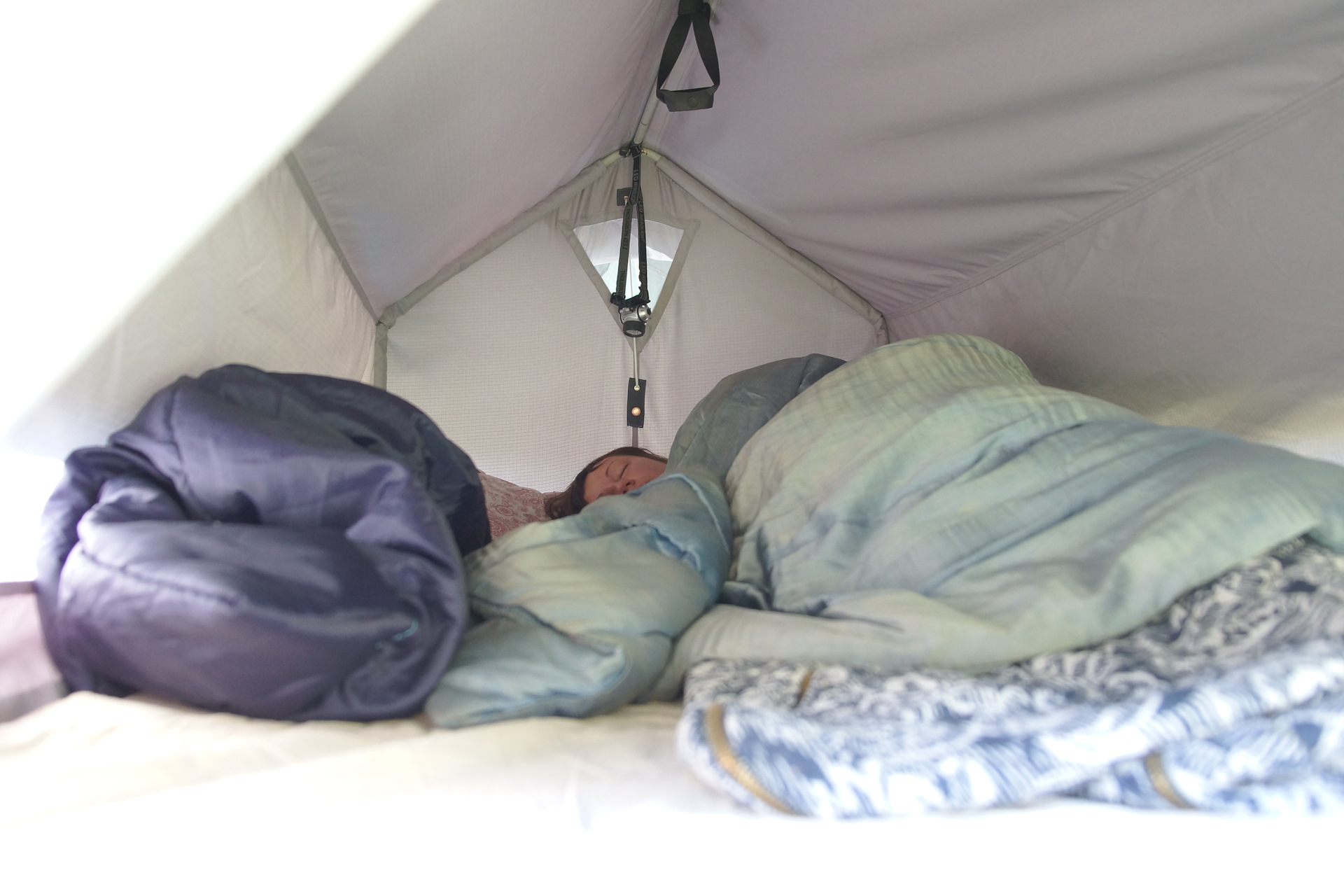 Недавно у кого-то тут было… Лист фанеры на крышу, и на него дешевая китайская двухместная палатка…)))