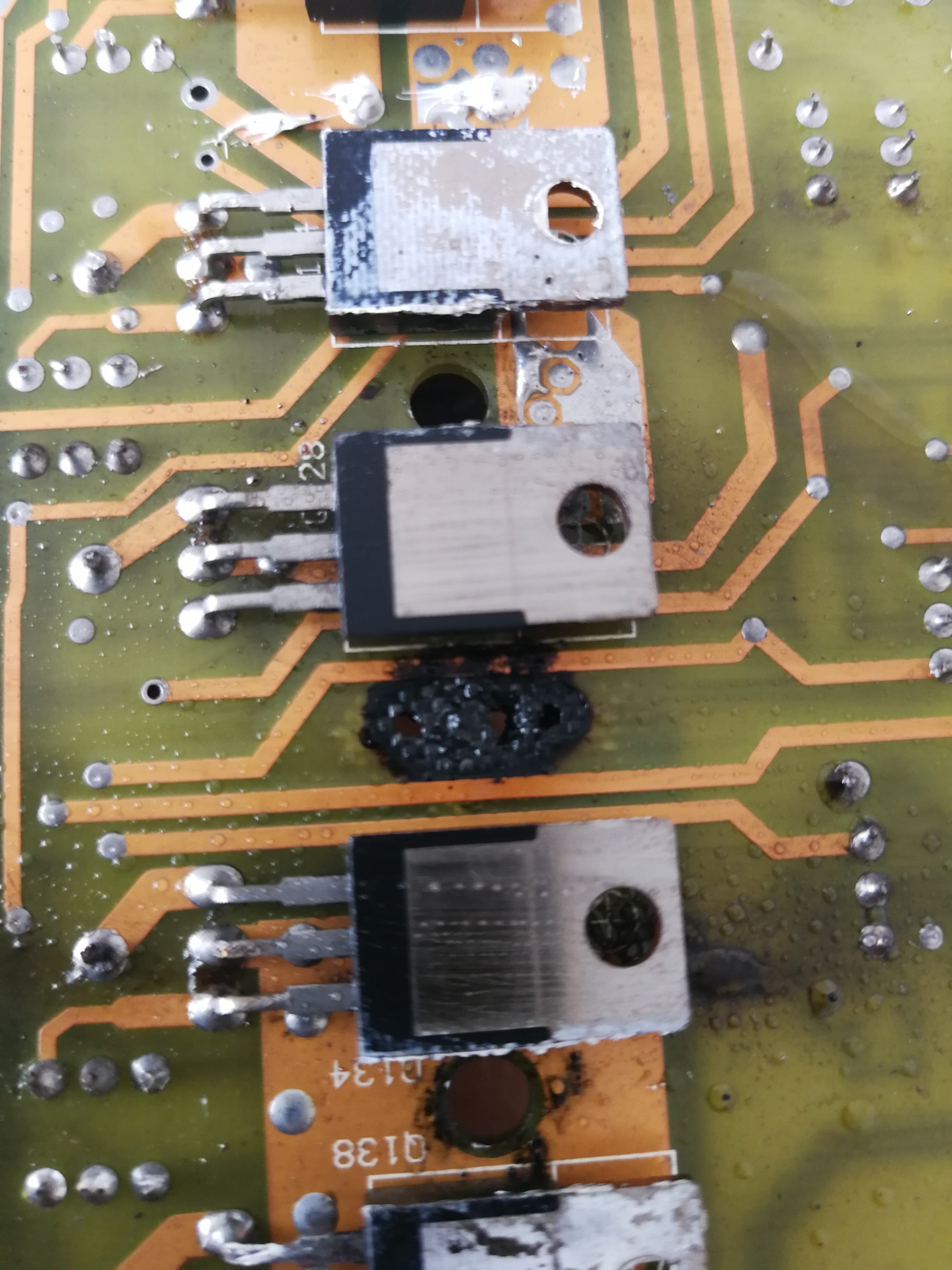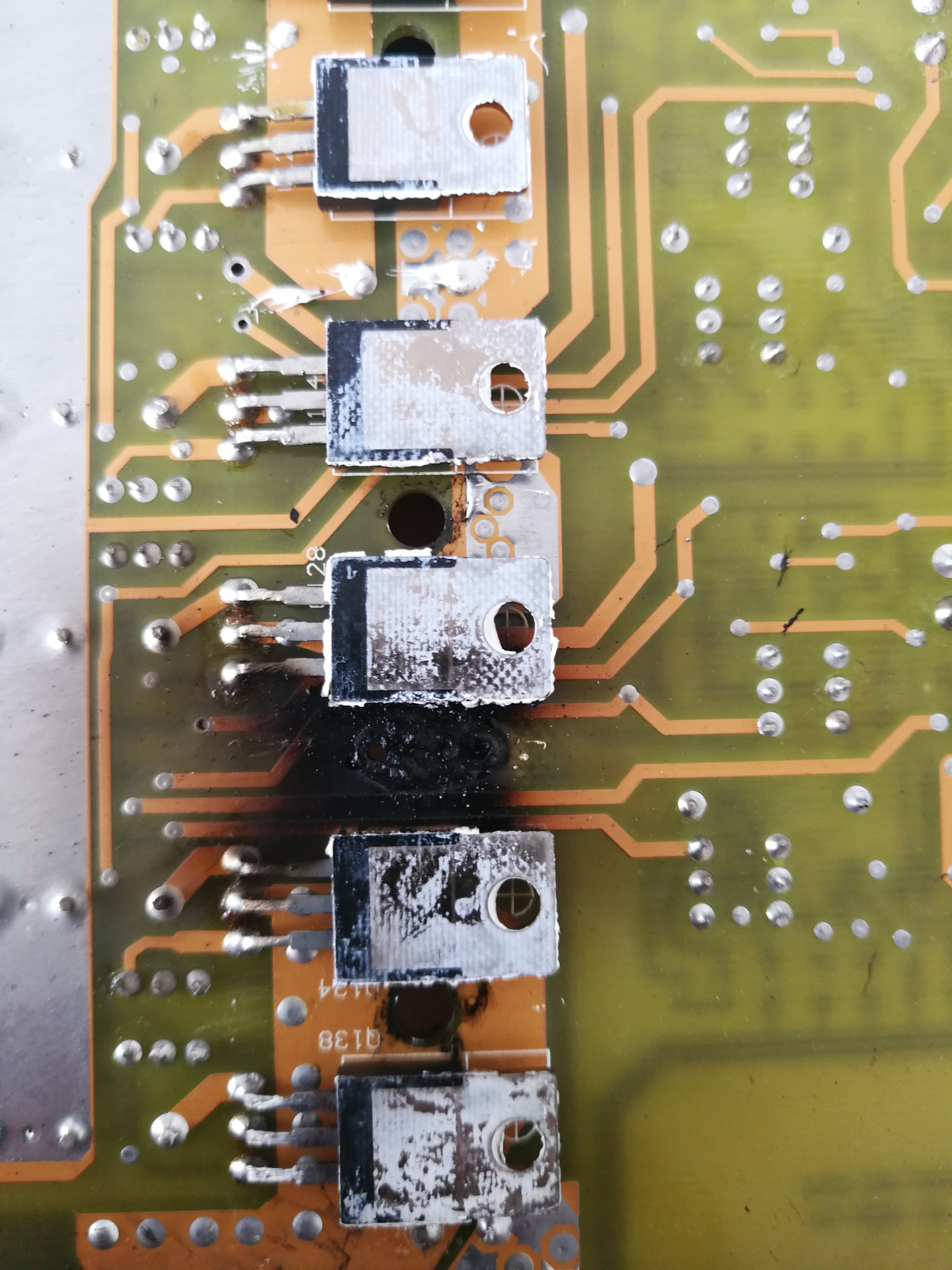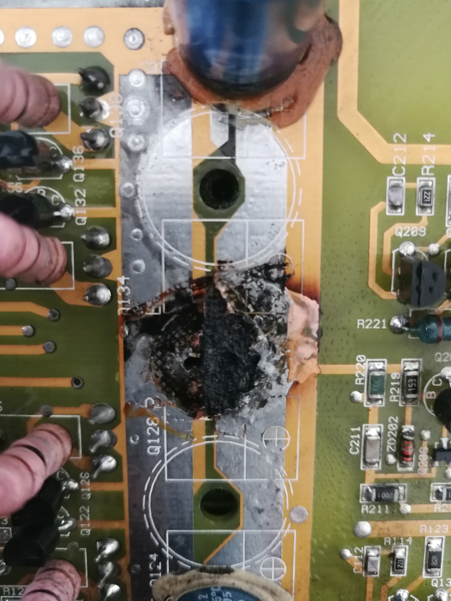 Открутил плату от корпуса и занялся чисткой. Судя по тому, что открылось за сажей, все не так уж и плохо. Чуть прогорела дорожка, но теперь надо бы понять какой она должна быть.