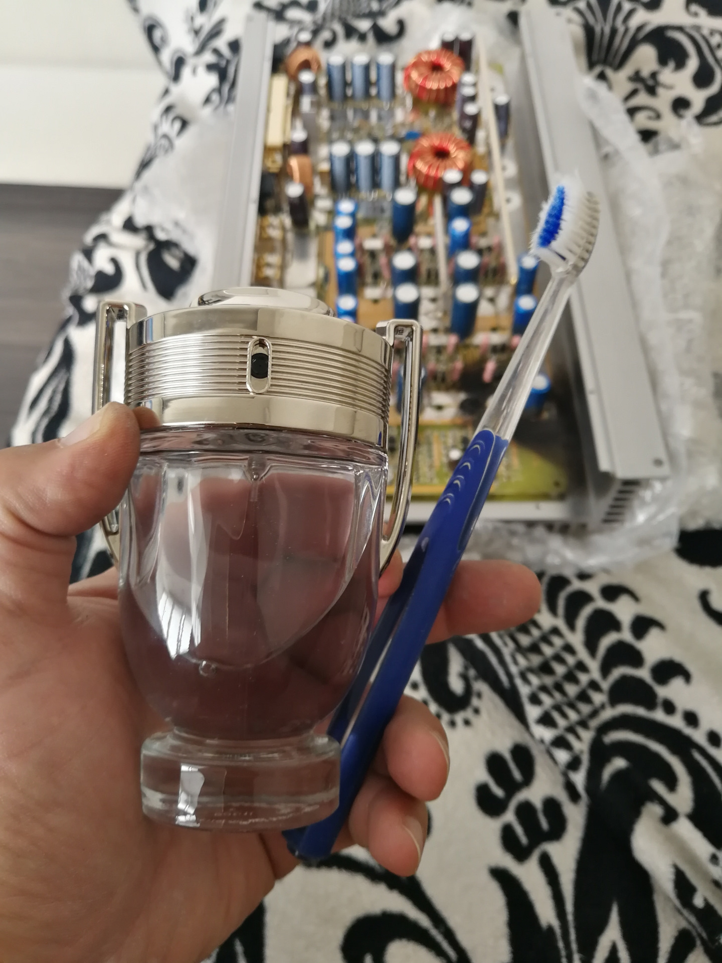 Но для оценки масштаба ремонта было решено хотя бы немного промыть плату, для чего на выручку пришел Paco Rabanne Invictus с зубной щеткой.
