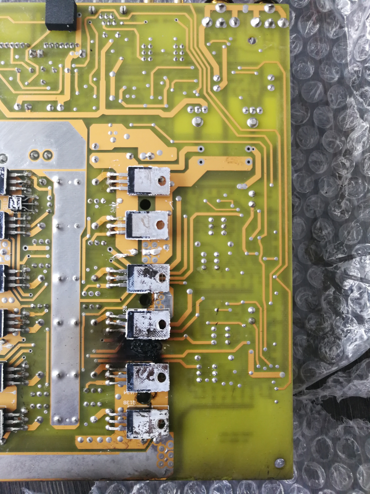 После того, как усилители были распакованы и выложены на пол для того, чтобы полюбоваться этой красотой, почуял тот самый запах паленого и начал обнюхивать. Источник запаха исходил из А6 и мне показалось, что это сгорел вентилятор охлаждения (предположил, что усилитель был вплотную прикручен к стенке и не было доступа воздуха к нему), но после снятия крышки убедился, что это не он.