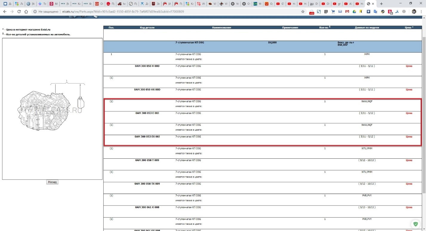 В каталоге ElCats необходимо выбрать вашу модификацию автомобиля, зайти в группу «3. Трансмиссия», и там выбрать коробку DSG7 DQ200 в сборе в соответствии с вашим двигателем, и затем вы увидите номера коробок (SW-номера), среди которых, зная 3-значный буквенный код КПП, сможете понять, какой подходит для вашего автомобиля. В моём случае у меня установлена КПП с кодовым индексом NAW, поэтому мне подходят варианты 0AM300053E и 0AM300053EX (как правило, X на конце в каталогах VAG обозначает деталь, восстановленную в условиях завода). Почему в моём случае номер, который показан в диагностике (0AM300052) и номер в каталоге не совпадают я скажу чуть позже, в большинстве случаев номер всё же совпадает, но иногда бывает так, как у меня, и что делать в таких случаях, тоже напишу дальше.