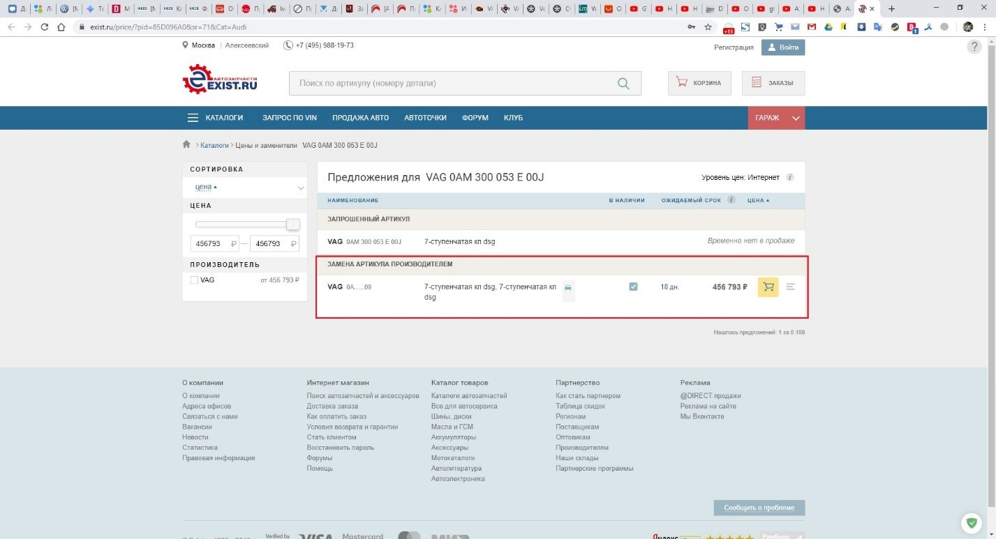 Хорошо, мы определили, что у нас установлена (или должна стоять с завода) коробка с SW-номером 0AM300053E. Теперь нам необходимо узнать, до какой версии можно максимально обновить коробку, чтобы искать прошивку под самую актуальную версию SW-номера. В случае с каталогом ElCats это довольно просто, но достоверность данных может хромать, ибо это в любом случае не оригинальный каталог, именно поэтому для максимальной достоверности я советую пользоваться ETKA, но всё же можно и через ElCats смотреть, я несколько автомобилей проверял – совпадало с ETKA. ElCats исторически связан с известным магазином автозапчастей Exist, поэтому при нажатии «Цена» автоматически перекинет на Экзист, где и будет показана цена, а также то, что нас интересует – последняя (актуальная) замена номера коробки.