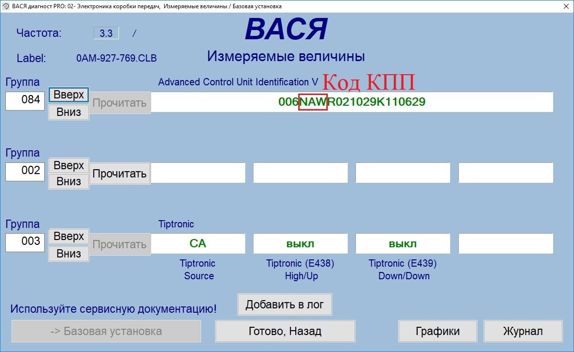 – посмотреть в каталоге запчастей (лучше использовать ETKA и иметь к ней файл с расшифровкой VIN’а автомобиля, но если её нет, можно с помощью каталога запчастей ELCATS). В случае, если нет ETKA или файла с расшифровкой для неё, нужно знать либо VIN автомобиля для расшифровки 3-значного кода КПП (из моего опыта, лучше всего получается расшифровывать на сайте # и в онлайн-каталоге запчастей ZZAP, в каталоге ZZAP код трансмиссии следует искать нажатием на иконку восклицательного знака в поле «Доп. инф-я»), либо 3-значный код установленной КПП, который можно узнать из сервисной книжки, увидеть на информационной наклейке с комплектацией на автомобиле, на корпусе коробки или же в 84 группе измеряемых величин в блоке коробки (4-6 символы):