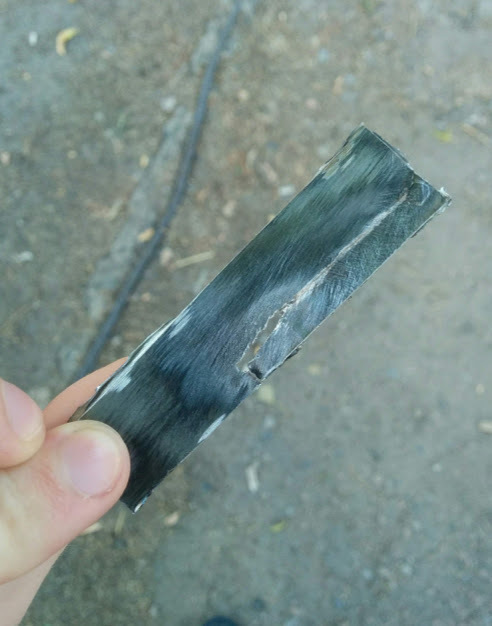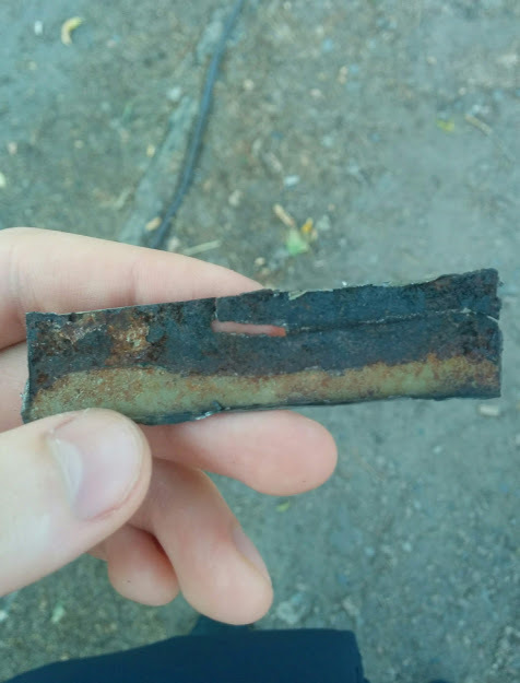 Как мы видим, это вырезанный болгаркой старый кусок арки. С лицевой стороны он зачищен до блеска металла, без единого намёка на ржавчину. Но дырки по центру — это следы шила. После того как я привез автомобиль, первое что они сделали — попробовали этот металл на целостность под краской (а вдруг и вправду пыль балуется?), и при первом прикосновении шила — вошло как в масло, почти не сопротивляясь. Потом дальше и дальше и дальше. В общем, было принято решение счесать всё и вырезать кусок арки. И тут прояснилось: