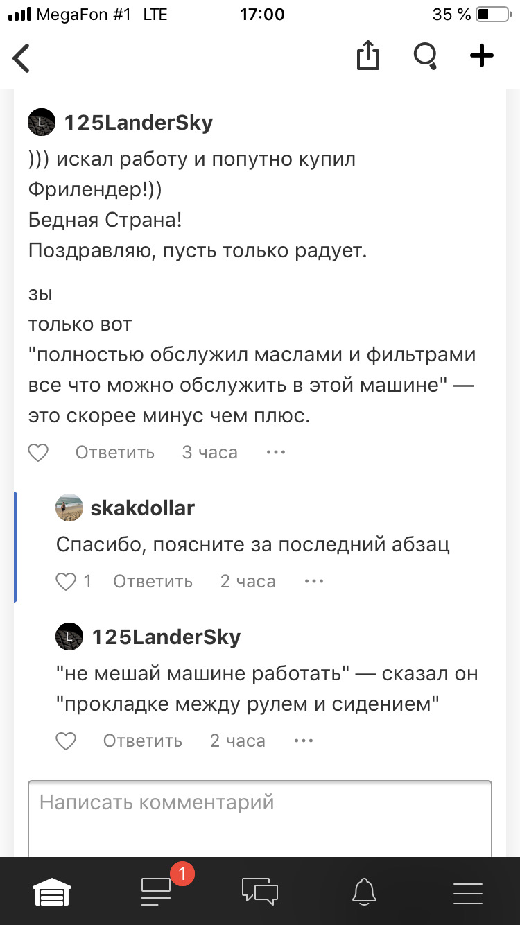 www.drive2.ru/users/125landersky/Уважаемые участники Драйв 2! Обратите внимание на данного «фрукта». Пишет мне комменты, а потом тут же их удаляет. Как Вы считаете:это нормально?) Уважаемый 125landersky!.. Желаю Вам набраться смелости и не стирать Ваши «веские» комментарии.Либо-пойти нахрен с Вашим, только для Вас, важным мнением. Честь имею!