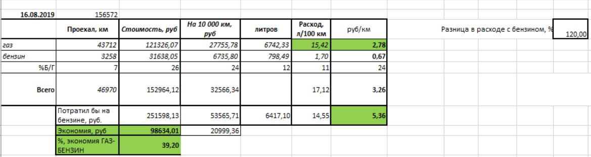 Расход газа получился за все это время 15,4 газа. И 0,3 бензина. неплохо.