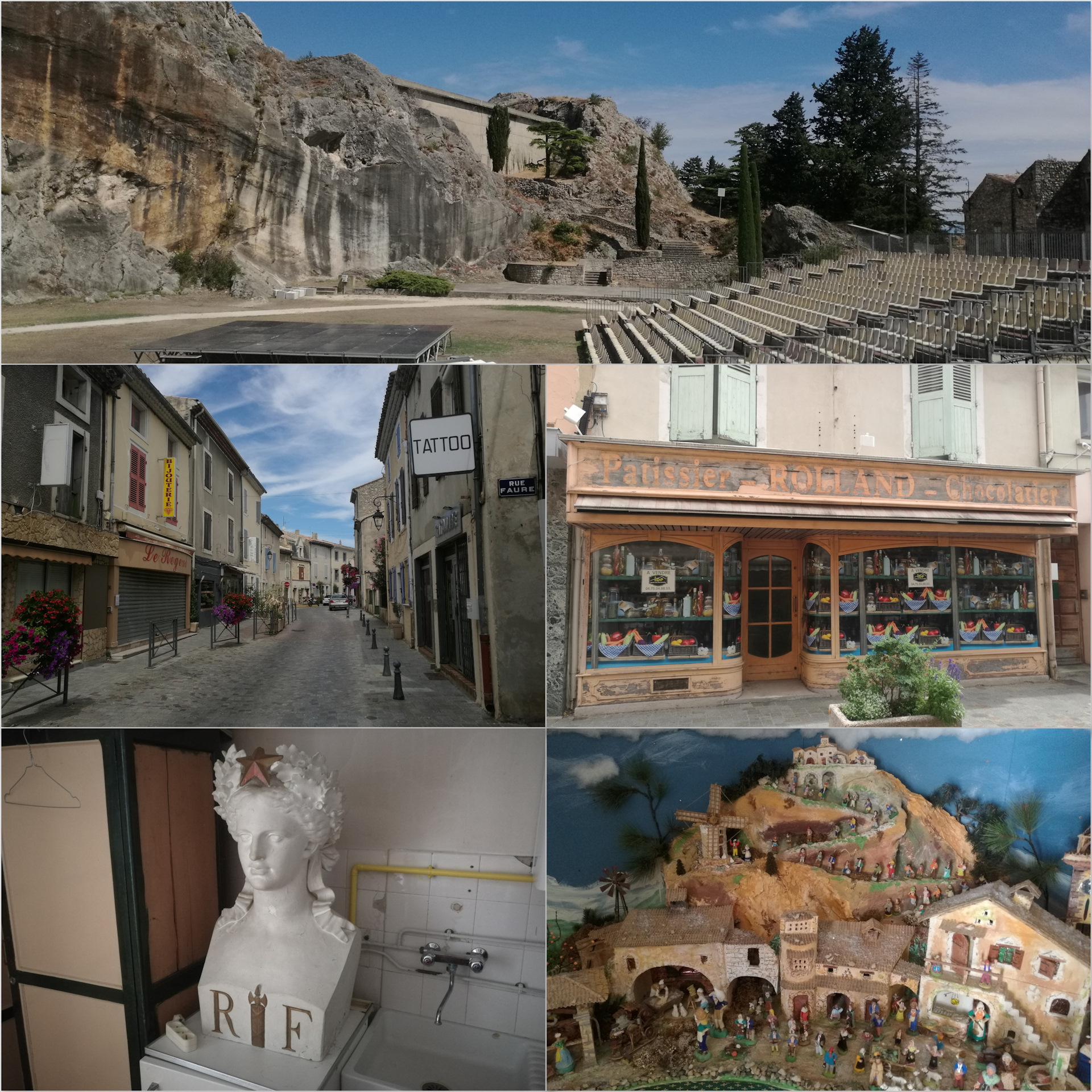 Город знаменит своей известняковой скалой, возвышающейся посреди равнины. Когда-то эта скала была огромного размера, но в процессе горнодобывающей деятельности постепенно ужалась до размера на фото. Теперь у ее подножия проходят театральные представления, а территория окружена забором. Когда мы там были – все было закрыто, но одинокая работница музея-театра любезно пропустила нас внутрь посмотреть на сцену. Заодно вкратце изложила историю города. В подсобных помещениях музея был обнаружен вот такой необычный бюст с символами Вишистской Франции и звездой на голове. Что это было? :)
