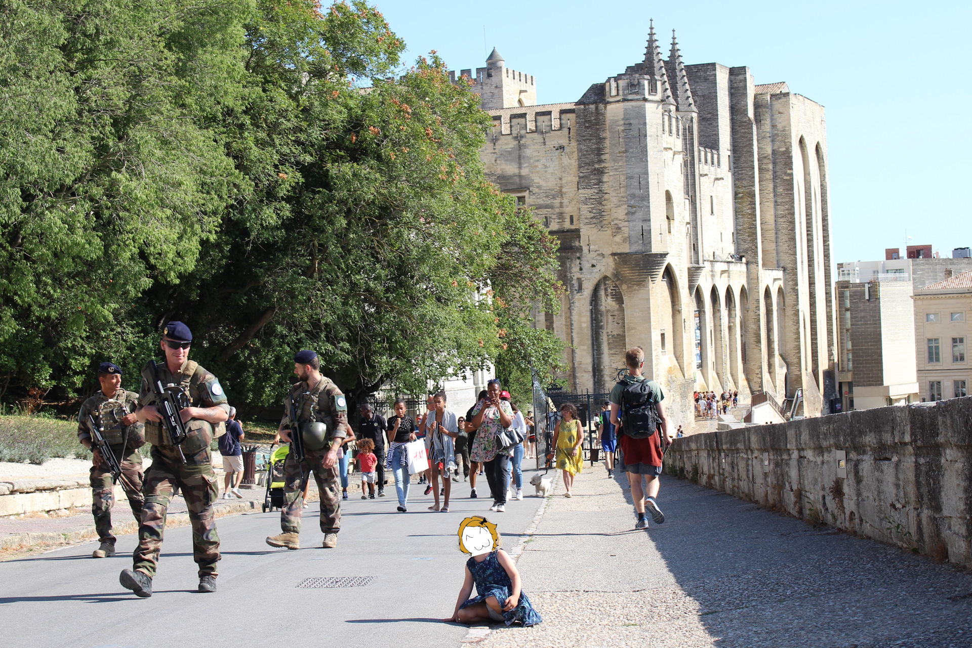 Папский дворец огромен. По идее это самое большое сооружение в готическом стиле, построенное в Средние Века. Но это неточно. Сколько раз я уже бывал в Авиньоне, но так и не посетил сам дворец. Обратите внимание на очередь. Пожалуй и сейчас мы только посмотрим на него снаружи…Взяли по мороженому и пошли вокруг Дворца против часовой стрелки. Кстати, с колясками рекомендую подниматься в парк Папского Дворца, расположенного наверху, именно с этой стороны, что на фото. Ну у меня же сил немеряно, поэтому коляску с малым я поднимал по лестнице с противоположной стороны.Музыканты в переходе исполняли «Bella Ciao». Атмосферно.Вид из парка на Рону. Наш дом где-то там, далеко вверх по течению.А это тот самый Авиньонский мост. А вы говорите в Европах не бывает откатов/распилов :DЧтобы у Папы всегда было хорошее настроение и бодрый дух, у него тут имеется свой виноградник.Военные патрули в местах массового скопления людей – обыденность для Франции второй половины 10-х годов.