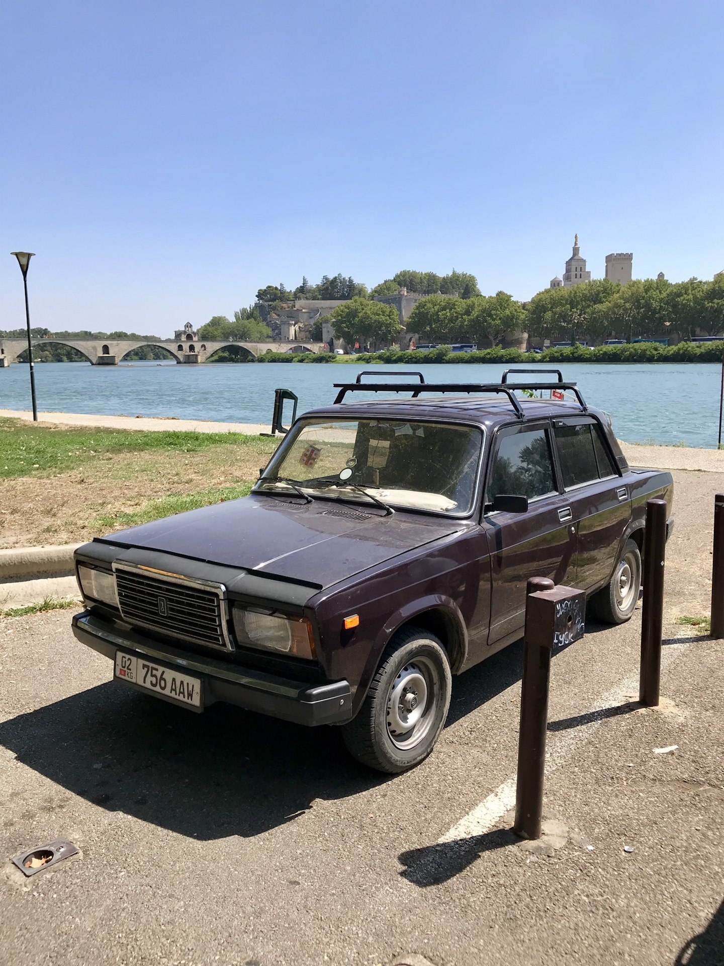 Это что было? ЖЫга с киргизским номером, грузинским флагом под лобовым и все это возле Авиньонского моста. Сюрреализм ))