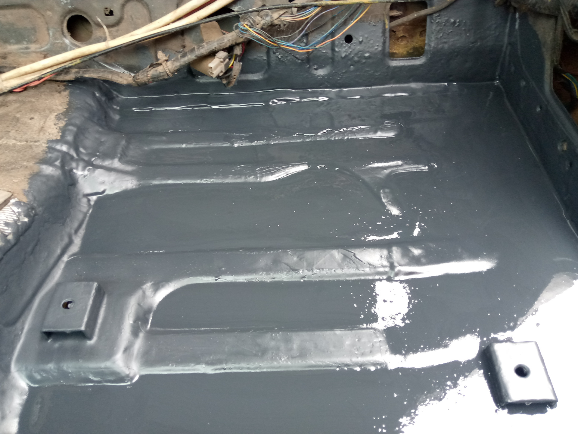 К сожалению ее не рекомендуется заливать толстым слоем, нужно чтоб просыхало и тут немного моя хотелка не срослась. Но в принципе она обладает свойством самовыравнивания и нанеся несколько слоев обычной кистью получил почти что хотел. Правда расход не маленький, ведра 10 л хватило только на сторону под сиденье пассажира, и то по хорошему я бы добавил еще слоя. Для того, чтобы вода вытекала подпилил бортик между порогом и полом в двух местах. Материал мазал после нанесения кислотного и акрилового грунта.