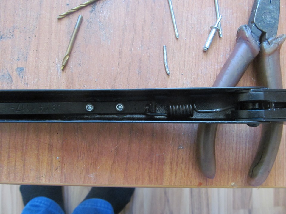 Делал эту процедуру, но без замены клепок.Сначала просто хотел подогнуть.Сломал отверстие для пружины.Ну а дальше сверлил и подогнул у первой клепки, чтоб пружину одеть.