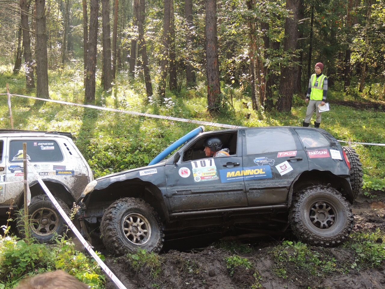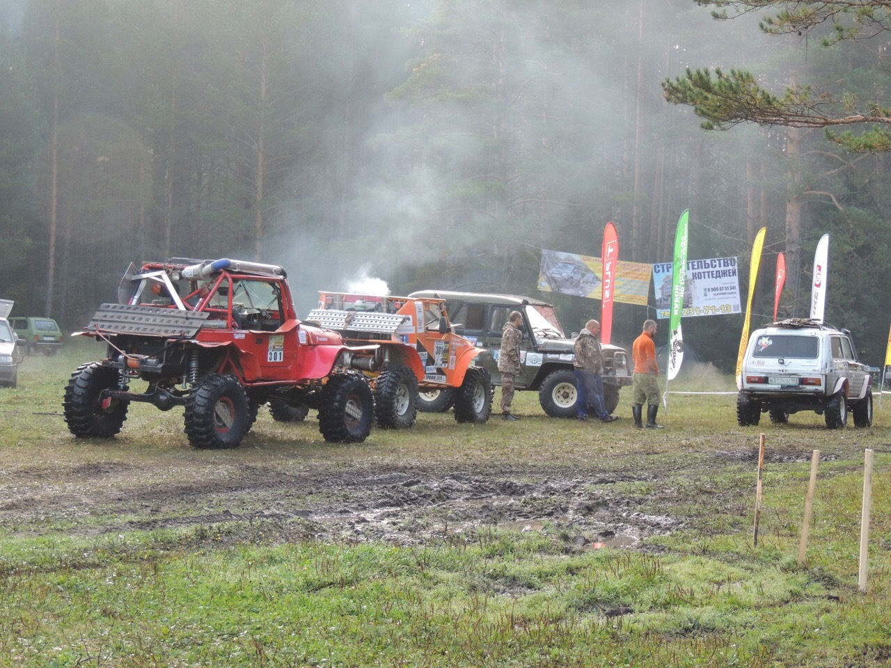 Старт. Быстрый, энергичный, красивый. Прямо в пробку. Опять картина маслом – Уаз стоит, а все остальные ждут. Трасса огорожена лентой, и протиснуться там просто нет возможности. В пробке стоят два класса ТР2 и ТР1. Поочередно — как и стартовали. Наверное, если б фотограф запечатлел эту картину спереди, то это выглядело бы брутально. На столько, что американец, посмотрев эту фотографию, сразу понял, что враждовать с Русским народом – это опасно. Стоит прям посередине колеи уаз, а на заднем фоне якобы его поддержка из нив, джимов, которые так и рвутся в бой становясь под критическими углами переворота. На самом же деле Уаз застрял, а сзади все пытаются его обогнать справа и слева, но колея и лента коридора не позволяли этого сделать.