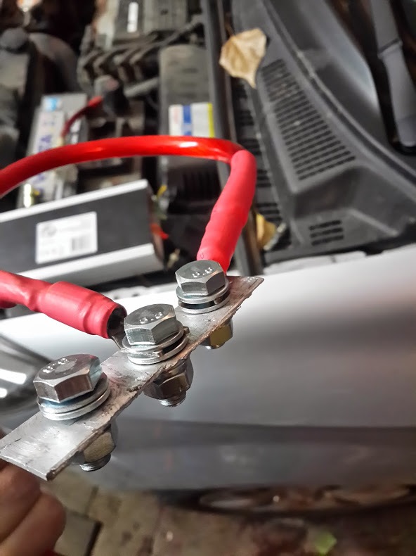 На картинке 3 изображена самодельная мычка с помощью шины от силового провода усилителя. Кстати не забудьте прикупить хорошую колбу с предохранителем на 80А, а так же убедиться в хорошем контакте. Все таки токи текут уже не детские.