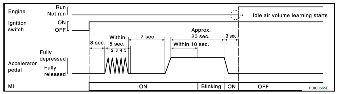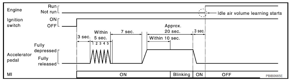 7. В течении 5 секунд повторите следующую операцию пять раз: — полностью нажмите педаль акселератора; — полностью отпустите педаль акселератора.