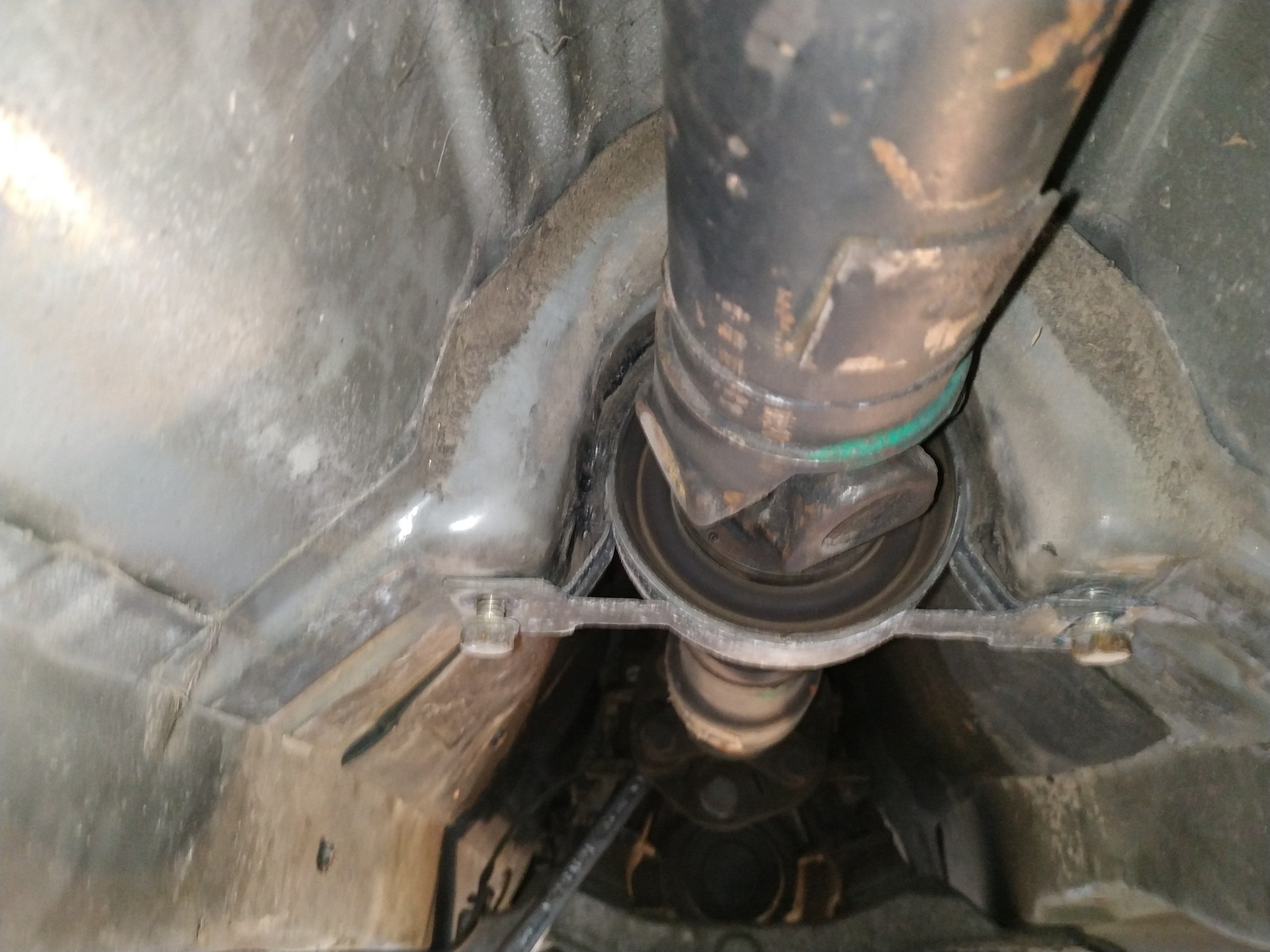 Кратко о демонтаже, для удобства выполнения работ, снимаем глушитель, за ним снимаем тепловой кожух (фольгу). Теперь у нас свободный доступ к карданному валу. Далее чтобы не снимать вес карданный вал, мы его разделили, открутили от коробки (эластичной муфты), открутили два подвесных подшипника от кузова и разъединили кардан (предварительно пометив), открутив соединительный болт. Теперь без труда извлекли его часть.