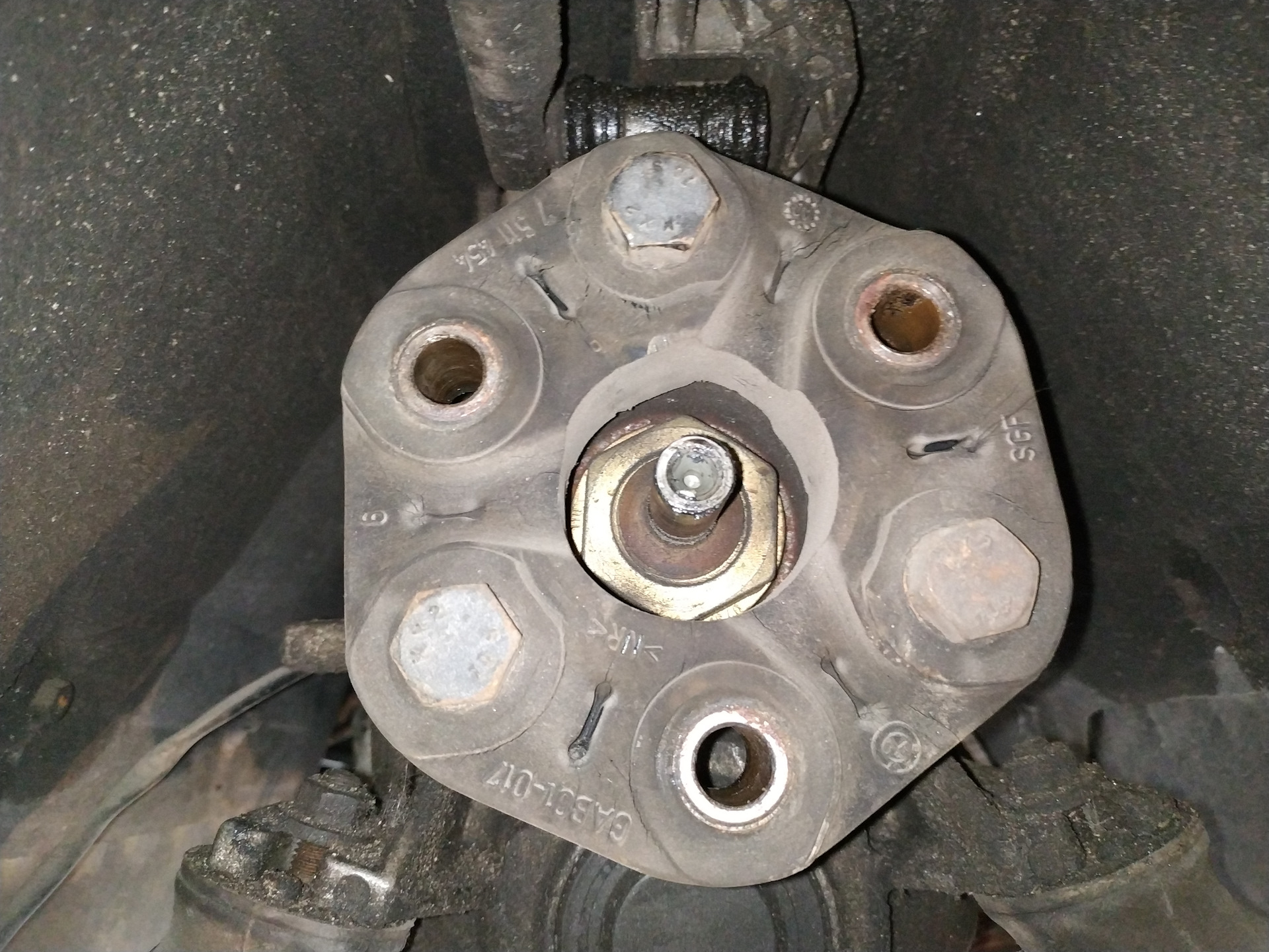 Далее всё это дело установили на место, вроде по меткам попали, зажали соединительный болт, зафиксировали тремя болтами к коробке передач, зажали болты и гайки фиксирующие подвесные на кузове. также зажали большую гайку на кардане, я так понимаю она регулирует длину кардана.В общем установили всё на своё место. Ну думаю всё, выезжаю проехаться… еде души не чаю, резкие ускорения всё в норме… Но как только пересёк черту 57км/ч появилась дикая вибрация, такое чувство, что сейчас что-то очень сильно бахнет, кидаю газ и всё нормализуется, тишина… Даю газу появляется вибрация еще больше чем было до того как мы поменяли подшипник. Знаете такое чувство что в багажнике стоит супер мега саб, который начинает дубасить. Просто жесть… я на минус сразу, звоню Вове, говорю мол беда, еще хуже, может мы что-то не зажили или еще что… Вова сразу предположил что возможно это совокупность, второго подвесного и крестовины которая люфтит, плюс эластичная муфта имеет трещины… Мол возможно совокупность всего этого. В общем решили всё-таки пересмотреть и перепроверить, перед тем как вернуться к Вове, выскочил на объездную, проверь когда появляется вибрация, в общем если плавно разгоняться то появляется она изредка и в основном от 57км/ч. Потом если отпустить газ и начать полегонечку прибавлять получалось набирать скорость без вибрации. Но проверил до 100км/ч.