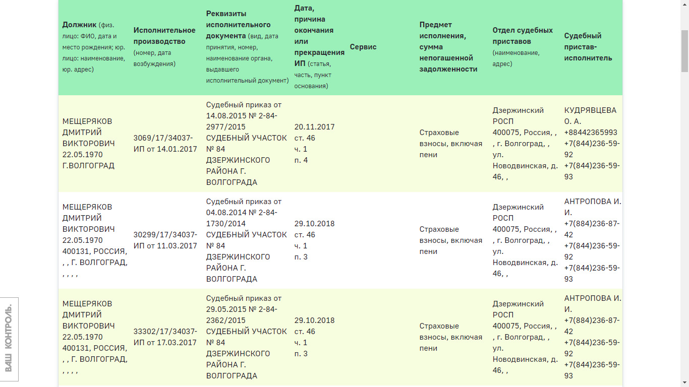 Тот уже устало (несмотря на то что шла вторая минута рабочего дня) поведал мне что не он, несмотря на информацию в базе, а какой-то отсутствующий сотрудник наложил арест на мои дензнаки, и что вообще всё верно — мол ФИО сходится. На мои доводы о том что я вообще никогда в жизни не был зарегистрирован в Волгограде, и что в случае чего меня раскулачивали бы мои местные приставы, что у него в отделении есть мой полный тёзка и что на том как раз есть исполнительные листы пристав отреагировал — ну наверное, не знаю, материалов дела НЕТ, давай так — я с тебя сниму изъятие средств, но в начале сентября тебе нужно будет приехать или оставь телефон, я тебе позвоню. Больше чем это удалось выжать лишь то что претензии ко мне со стороны страховой группировки "Согласие".