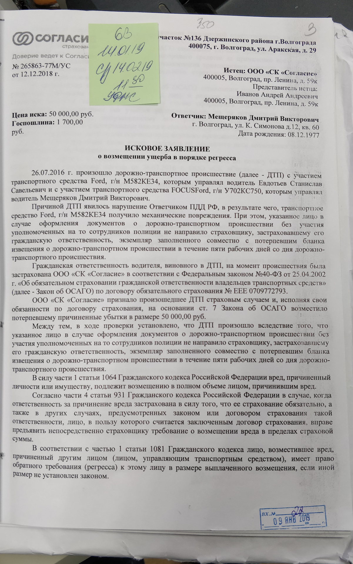 В начале лета тоже иск от Согласия прилетел на большие для меня деньги. К счастью все закончилось на моем заявлении о сроке давности. Хотели взыскать с меня за старое ДТП 2015 с Фордом Фокусом. Контора гнилая конечно