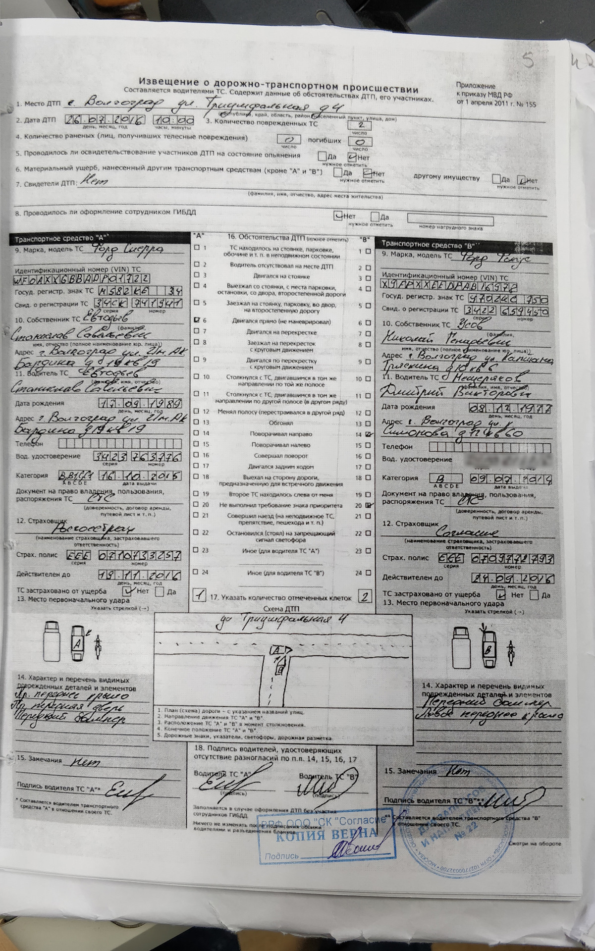 Да, в европротоколе мои паспортные данные и номер ВУ. Подпись не моя, почерк не мой, о событиях представления не имею, ни одного участника этого цирка не знаю. Зафиксировал материалы, вышел, сел в машину. Набрал знакомым гайцам, те в шоке, но пообещали узнать не делался ли дубликат моего ВУ. Позвонил автоюристу, назначили встречу через 2 часа.