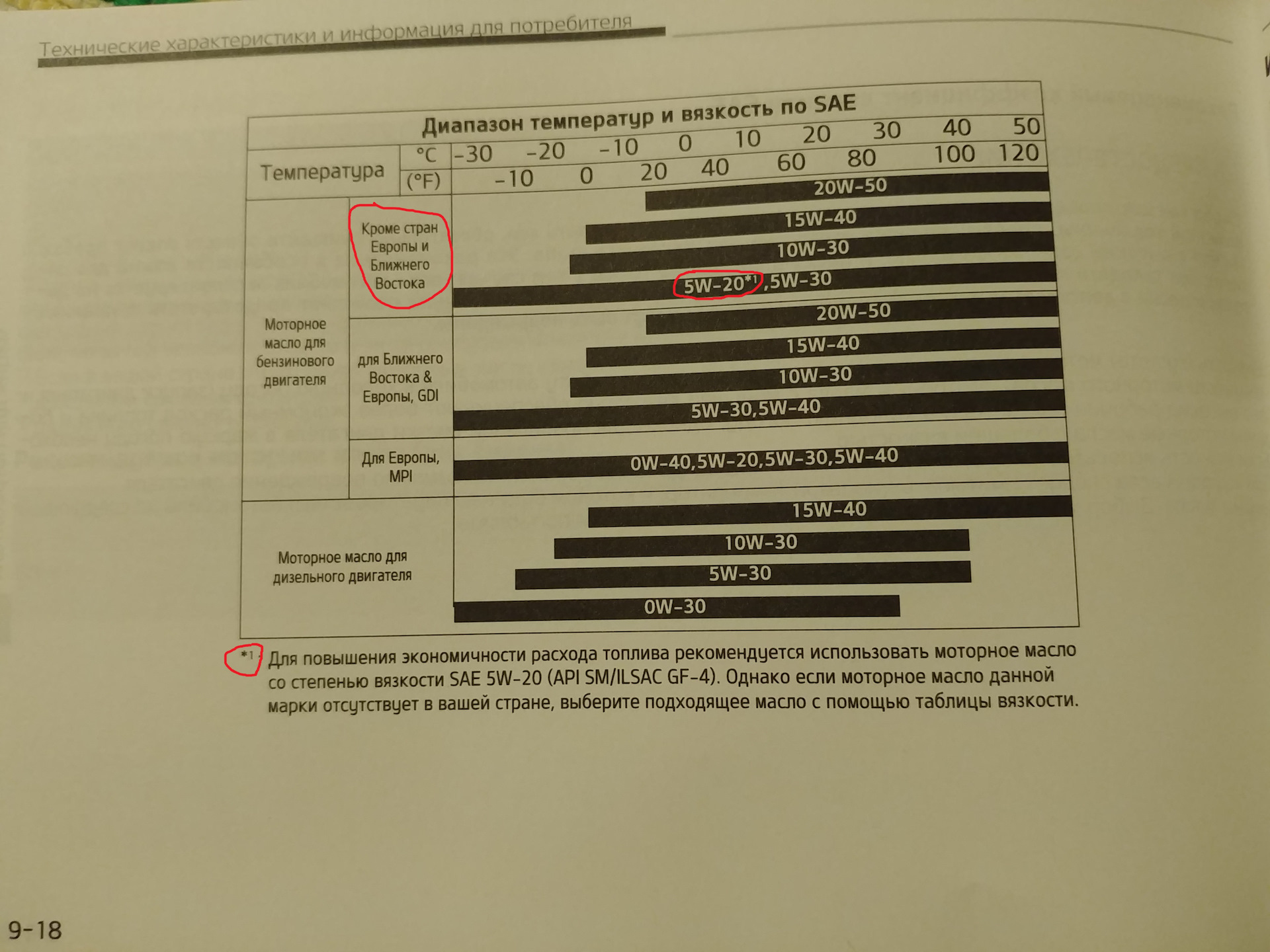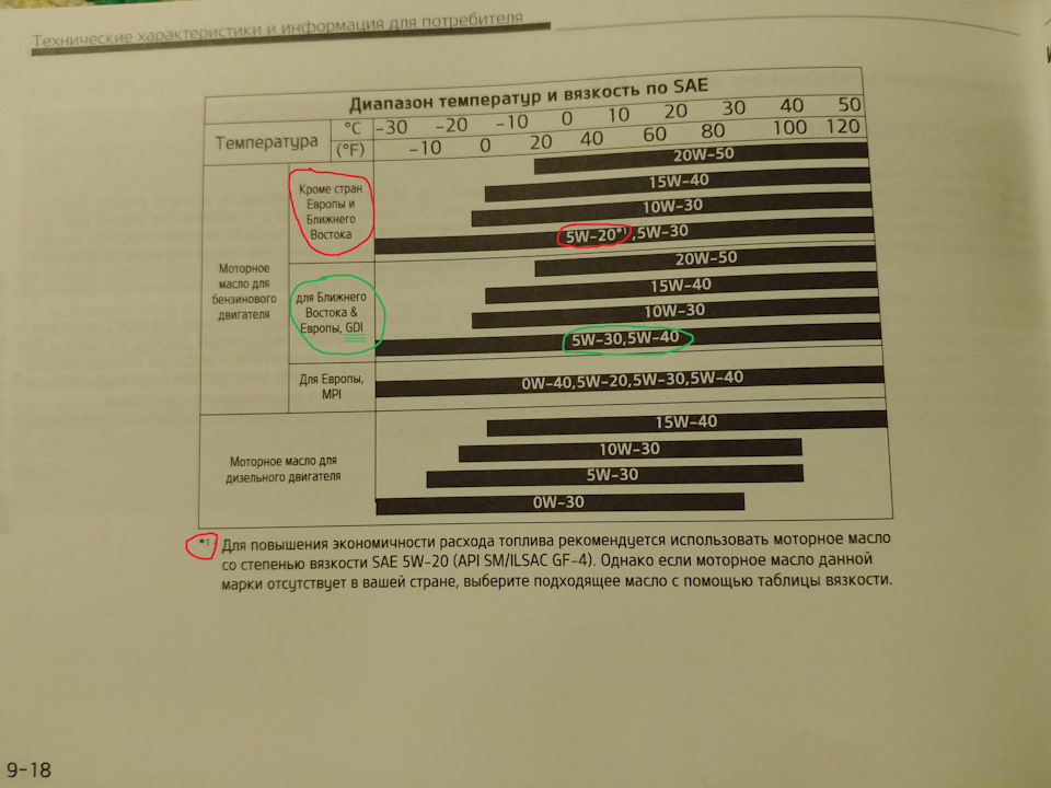 Неправильно вы читаете. Звездочка стоит именно к классу вязкости в соответствующем регионе. Почему же она не стоит в строке для Европы и MPI?! Как раз для вашего GDI 5W30 и 5W40, выделил зеленым! А на предыдущей странице ни слова про 5W20 не сказано, а что инструкция относит к менее вязким маслам не указано, это может быть также и 5w30.