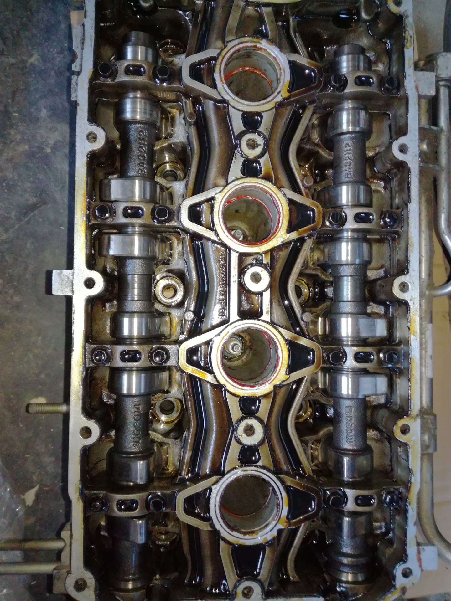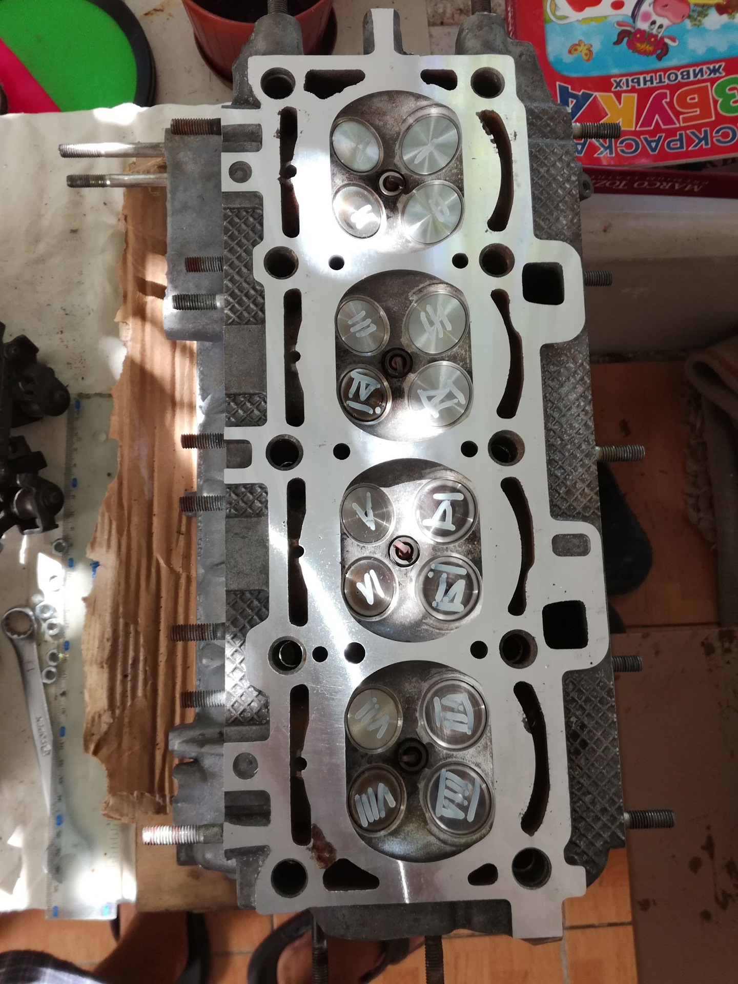 Обратите внимание на привод. Существует несколько модификаций третьего поколения 4AGE он же Сильвертоп (название из-за серебристой клапанной крышки). С механикой, автоматом, круизконтролем и пр. Короче, даже тоетоводы у которых я спрашивал — не могут толком сказать с какой модификации идут заслонки с таким приводом. И если вам он попадется — это жопа. В сборе его поставить на ВАЗ с вертикальным расположением не получится. Но об этом потом. В общем, для внедрения японского продукта инженерной мысли нужны две путевые вещи. Во первых — хорошая голова. Во вторых хороший коллектор. С головой у меня проблемы. Ну это ж видно по записи )). Нужна была позабористей. Вот тут хочу сказать большое спасибо товарищу dipos, который помог найти б/у голову по вменяемой цене и уболтал Евгения Чихватова ее распилить под мой коллектор. Доработка седел на станке, рабочая фаска 0,5 мм, клапана Т-образные переточка из серийных, просадка седел на 1 мм. Просадку рекомендую делать всем у кого база валов меньше 32 мм. Гидрики будут работать тише.