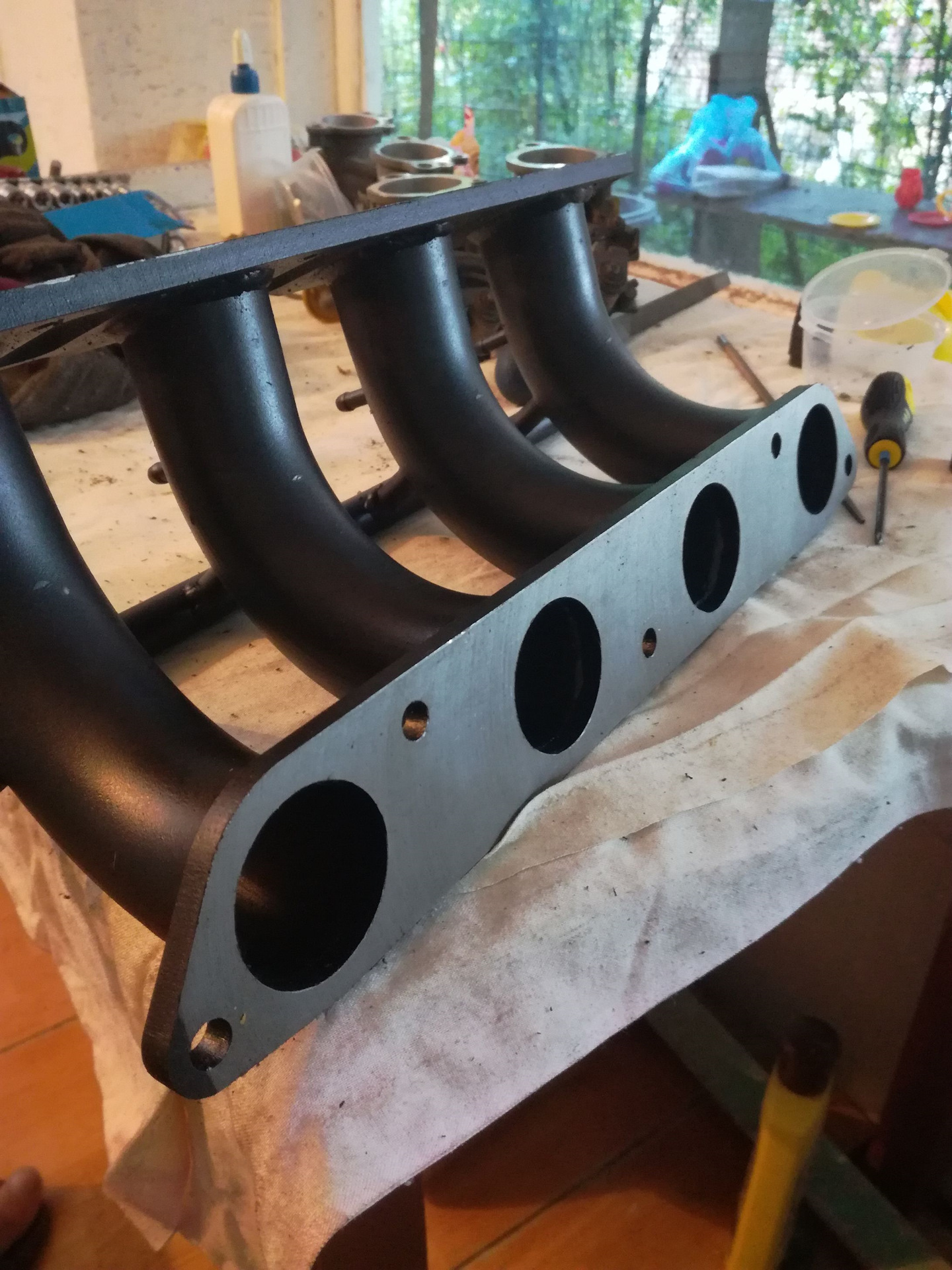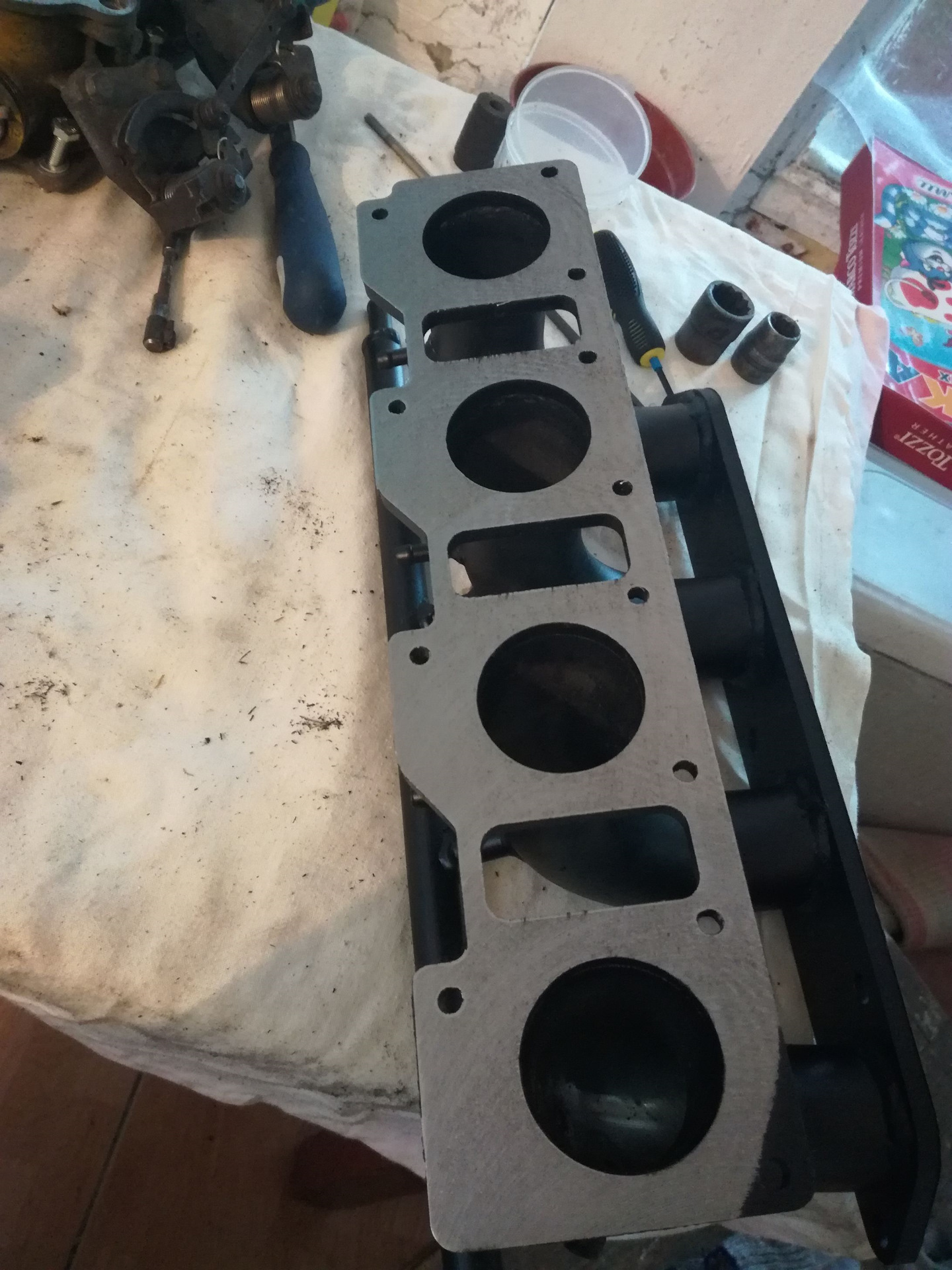Обошелся в пять рублей. Сделали кроме рампы 4 штуцера под ДАД и один под вакуум с 1-го цилиндра. Этот коллектор также имел кривые плоскости (потому, что варили его без кондуктора и фланцы от перегрева повело), но зато соосность узлов на нем четкая. Никакого напиллинга. Дальше хочу обратить ваше внимание на вот этого товарища wolcheeek. Выражаю ему огромный респект за мануал по настройке и синхронизации дросселей, которым я успешно воспользовался и всем советую. А также за ответы на мои дурацкие вопросы )). Продолжу в следующей части.