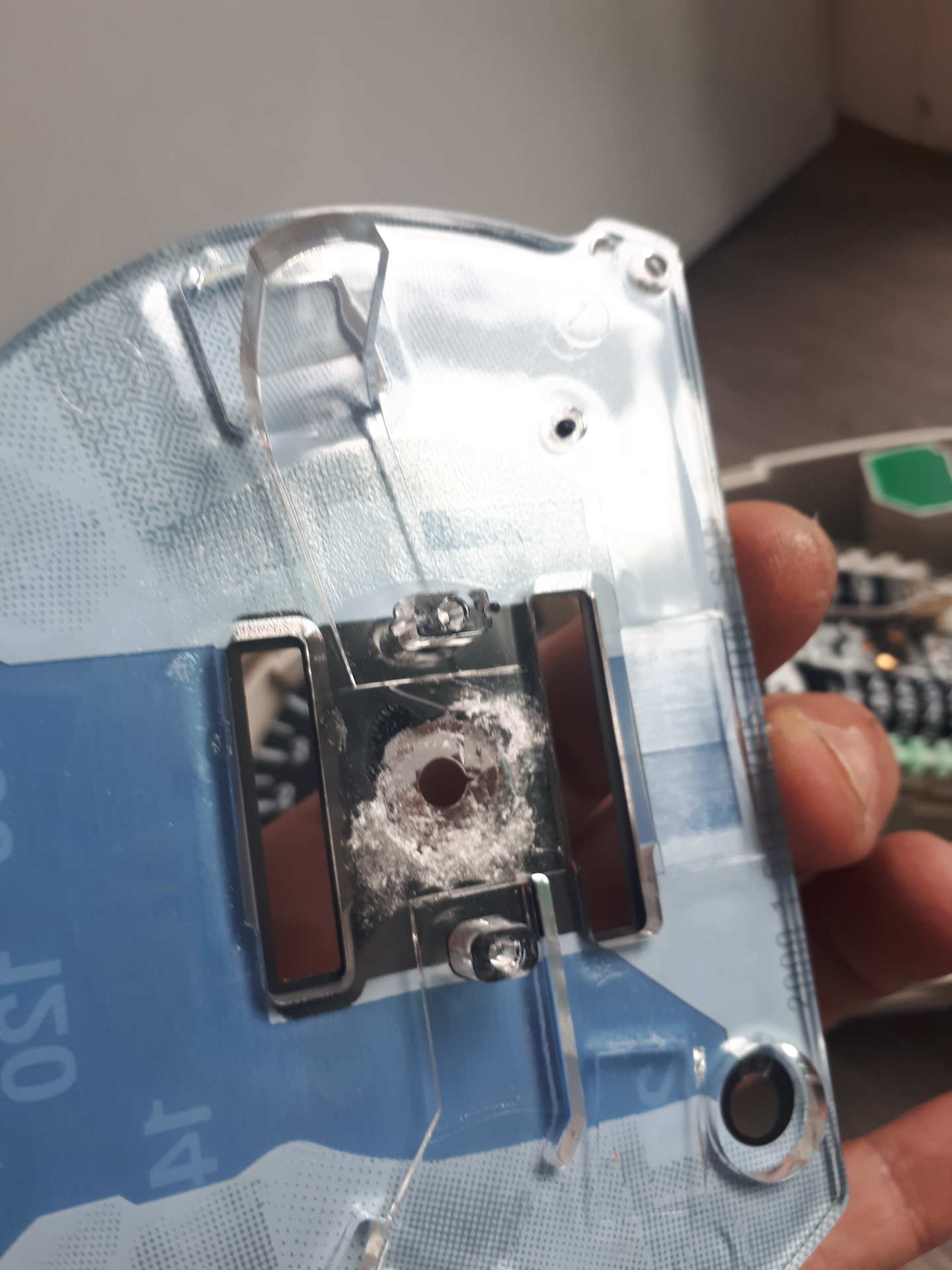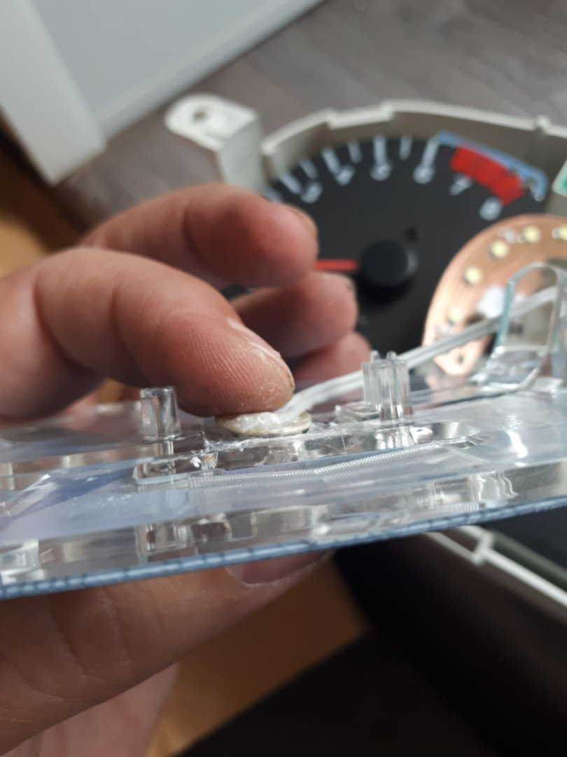 В общем вынимает ограничитель пласкогобцами тянем его ровно вверх с усилием ( он выходит) отклеивате шкалу. Затем рассверливаете центрально отверствие до нужного размера (т.к. подсветка спидометра круглая по форме на фото видно будет) нужно сделать так чтобы оно было как бы внутри пластика