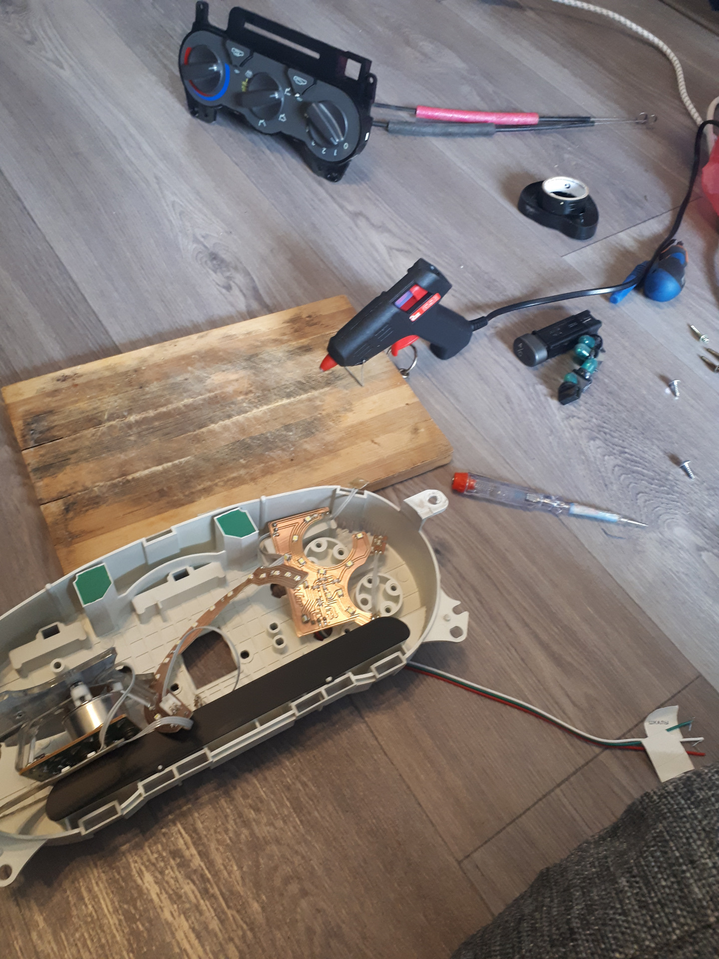 Затем выкручиваем спидометр и тахометр из приборки и размещаем внутри нашу подсветку ( клеил на термоклей.