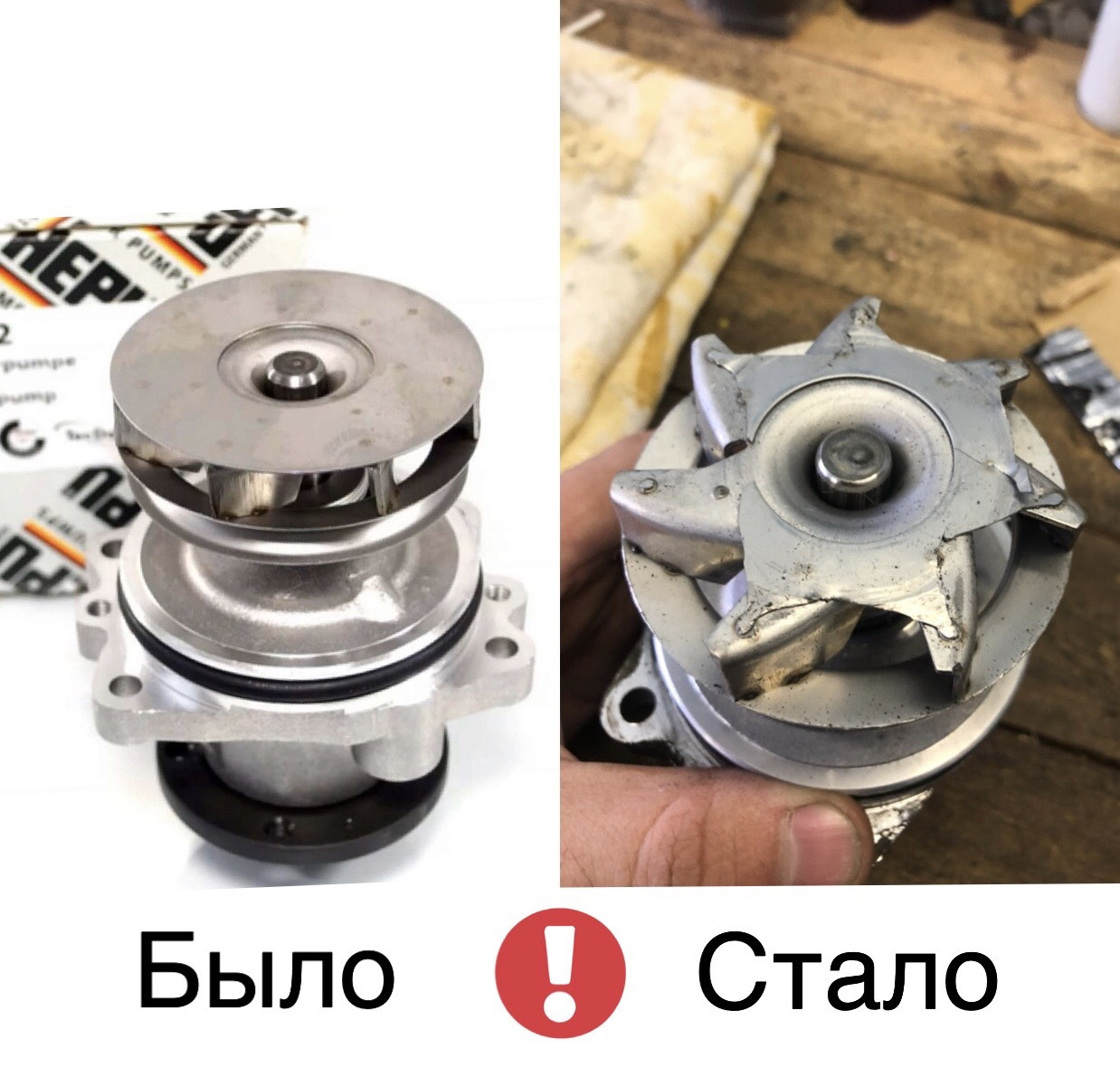 Помпа отжила своё, а точнее это 3 года или 50.000 км. Стояла HEPU, с железной крыльчаткой. А теперь самое вкусное…месяцев 7 не могли найти в чем причина свиста или неприятного звук под капотом. Он то появлялся, то исчезал, особенно на прогретую. Летом так вообще не наблюдался, настала осень, а может уже и время пришло и тут даже проявляться стала вибрация нет от нет. Как оказалось приличный люфт из-за разбитого подшипника. А заменили до этого все ролики, натяжители, на гене подшипники. Итог помпа. Но это ещё не конец, сняв её были в небольшом шоке, фото прилагаю. Теперь никогда не буду покупать помпу с железной улиткой, может брак, а может ещё что. Но это мой вывод, для себя только.