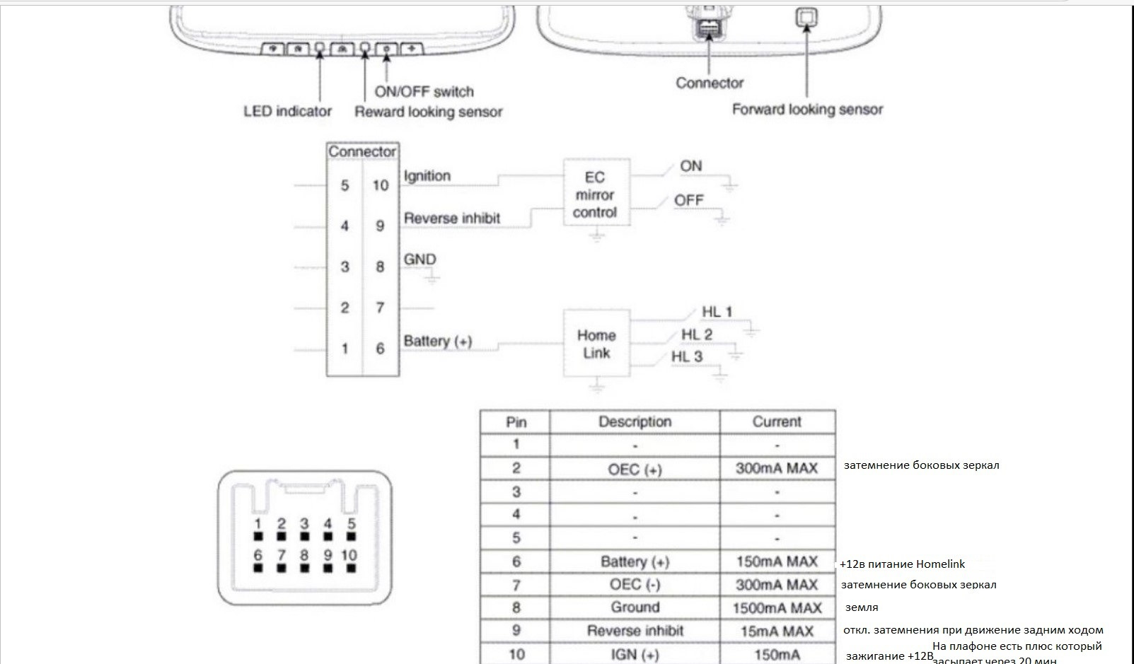 Привет, у меня вот такое зеркало, 3 контакта, задача чтобы работало автозатемнение и хомелинк, помоги с распиновкой