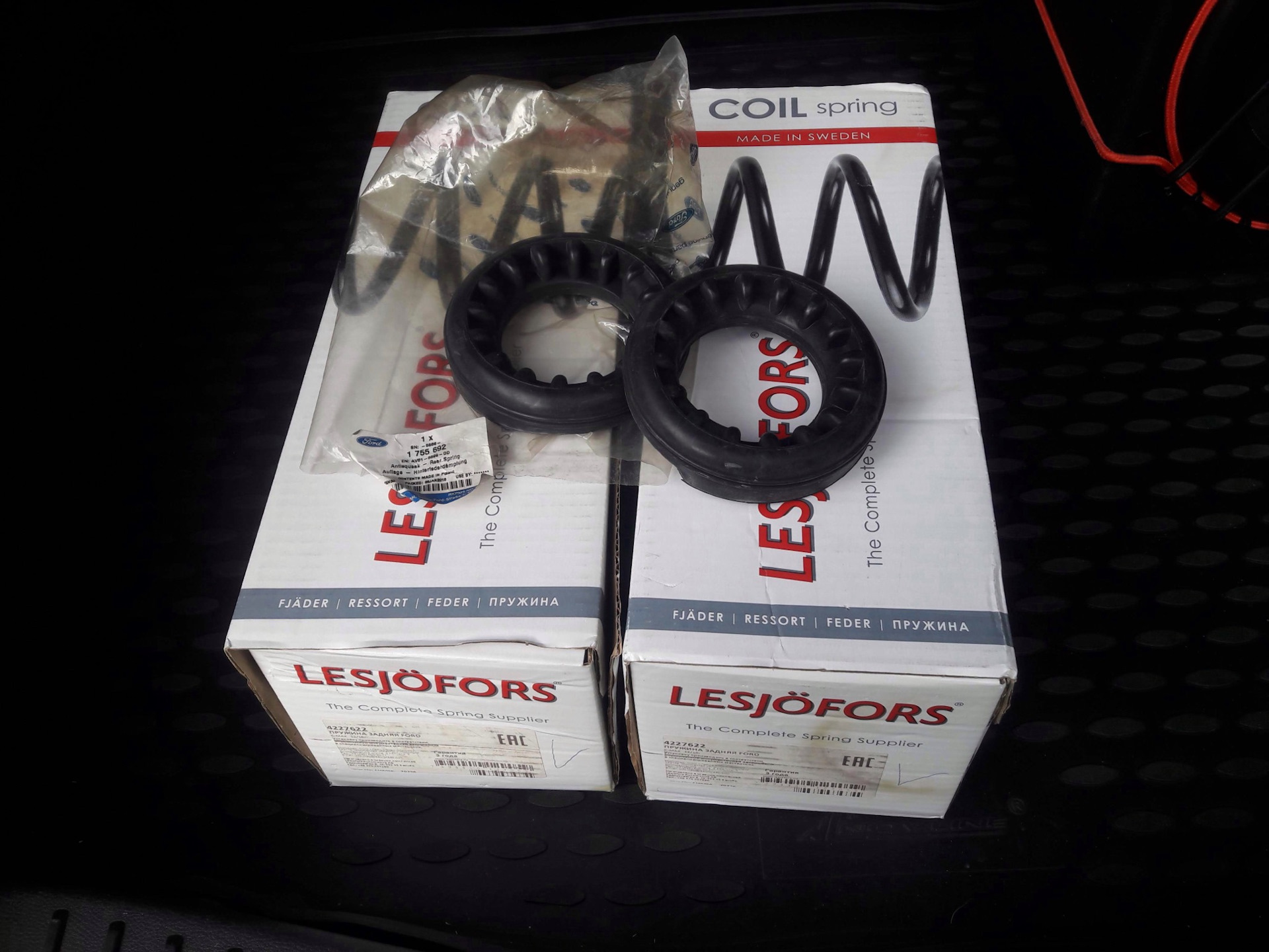 А кто ищет, тот, как известно, всегда найдёт, поэтому совершенно случайно напоролся на объяву по продаже за не очень дорого новых задних пружин Лейшфорс на СиМакс, да не простых, а ещё и усиленных. Убедившись в том, что они точно встанут в зад простому Фокусу, с утречка поехал и прикупил их, получив ещё при этом в виде бонуса новые оригинальные верхние резинки. А уже днем заскочил на часок в дружественный сервис, где все это добро без особых проблем было установлено на свои законные места.