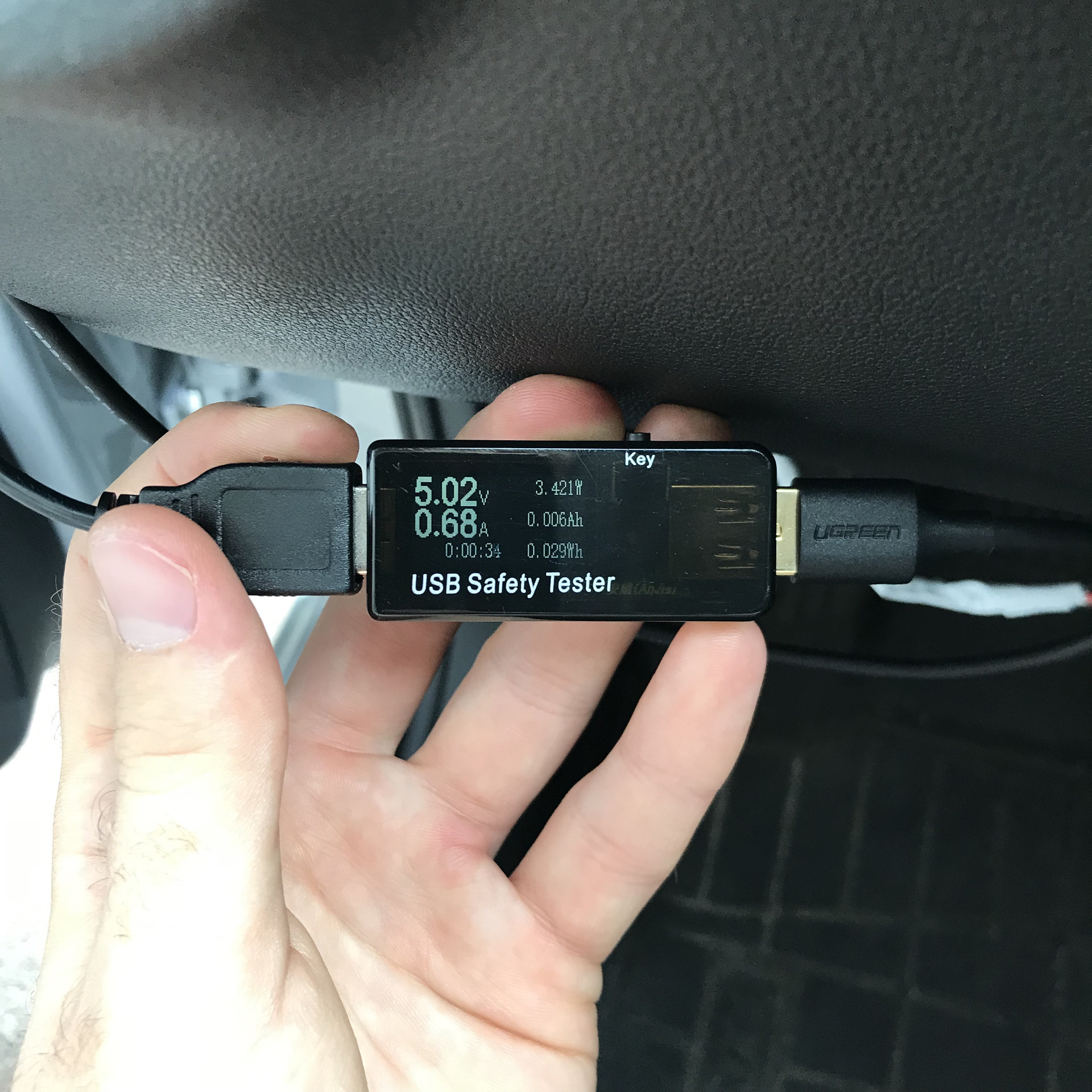 После этого всё соединил и на всякий случай проверил USB-тестером, какое напряжение выдаёт преобразователь напряжения при включении зажигания.
