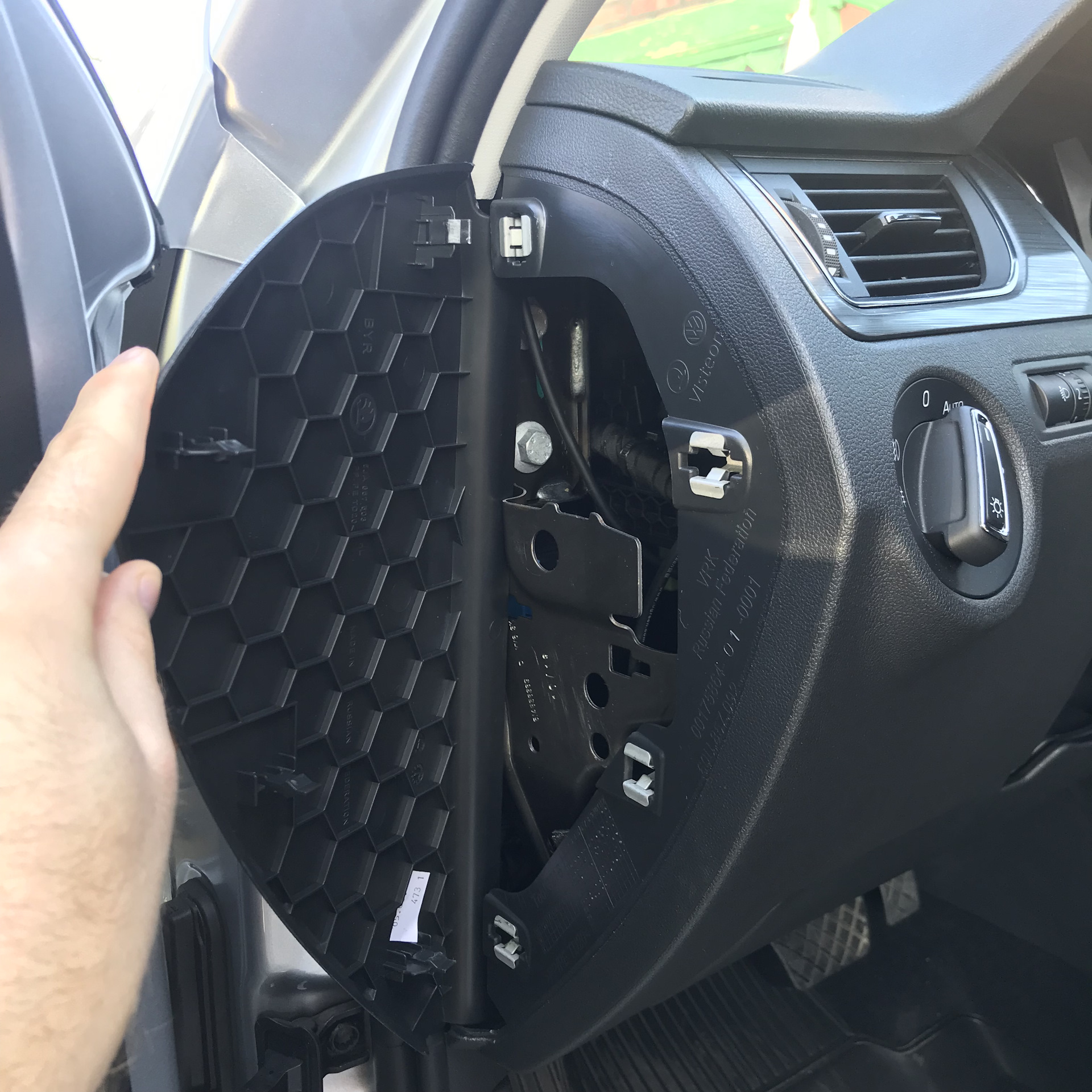 Затем проложил кабель от регистратора под пластиковой обшивкой левой стойки (без её снятия). После этого снял левую боковую накладку панели приборов и вывел кабель в свободную область.