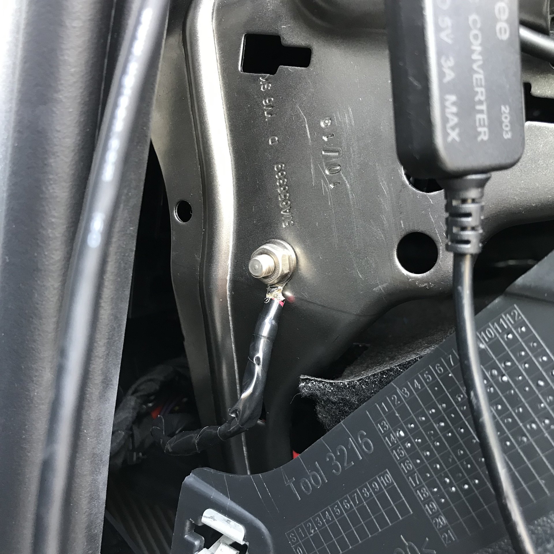 Преобразователь напряжения поместил над блоком предохранителей. Черный «минусовой» провод преобразователя прикрутил болтом и гайкой к одному из отверстий в металлической основе, на которой крепится «торпедо».