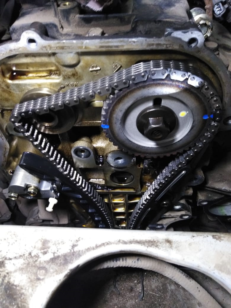 Всем доброго дня! Сегодня расскажу вам, какие запчасти необходимы для замены цепи ГРМ на моем моторе. Это будет полный список со всевозможными резиночками и прокладочками, поясню тем, что на всех деталях, которые снимаютя, меняются все сальнички, уплотнители и т.д.на оригинал. Это сугубо мое мнение, не для критики, каждый сам для себя выбирает, какую запчасть купить (китай или оригинал), Выбор пал на оригинальные з\ч, так как машину продавать не собираюсь, ресурс китайских комплектов под сомнением, да и удовольствие это не из дешевых! Делал не сам, а у знакомого мастера в гараже. Фотки делал он по моей просьбе для БЖ. О состоянии цепи на пробеге 203к рассказывал здесь.