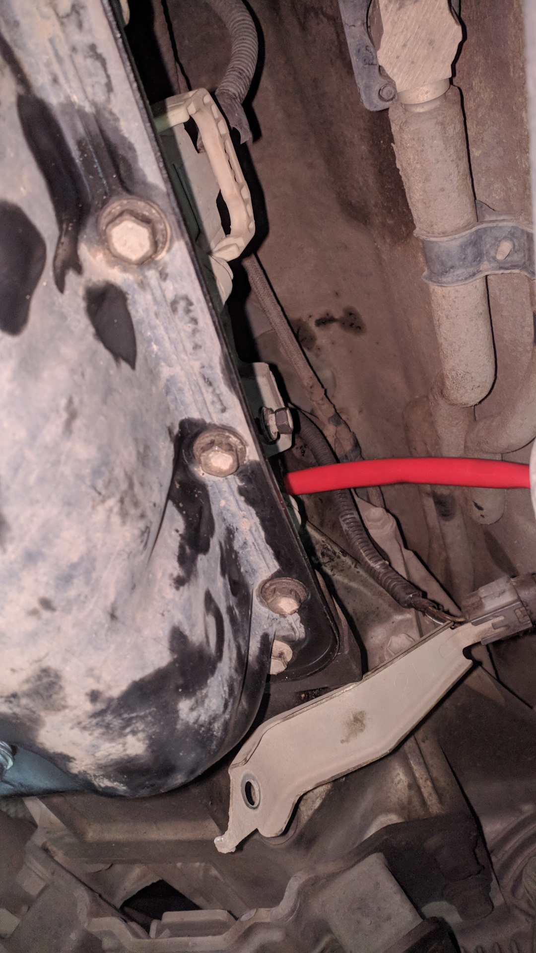 Откручиваем заливную пробку (находится слева на корпусе АКПП. Отметил стрелкой.) Предварительно нужно открутить кронштейн провода задней лямбды.