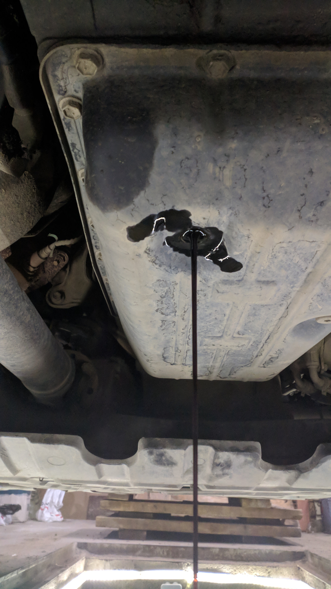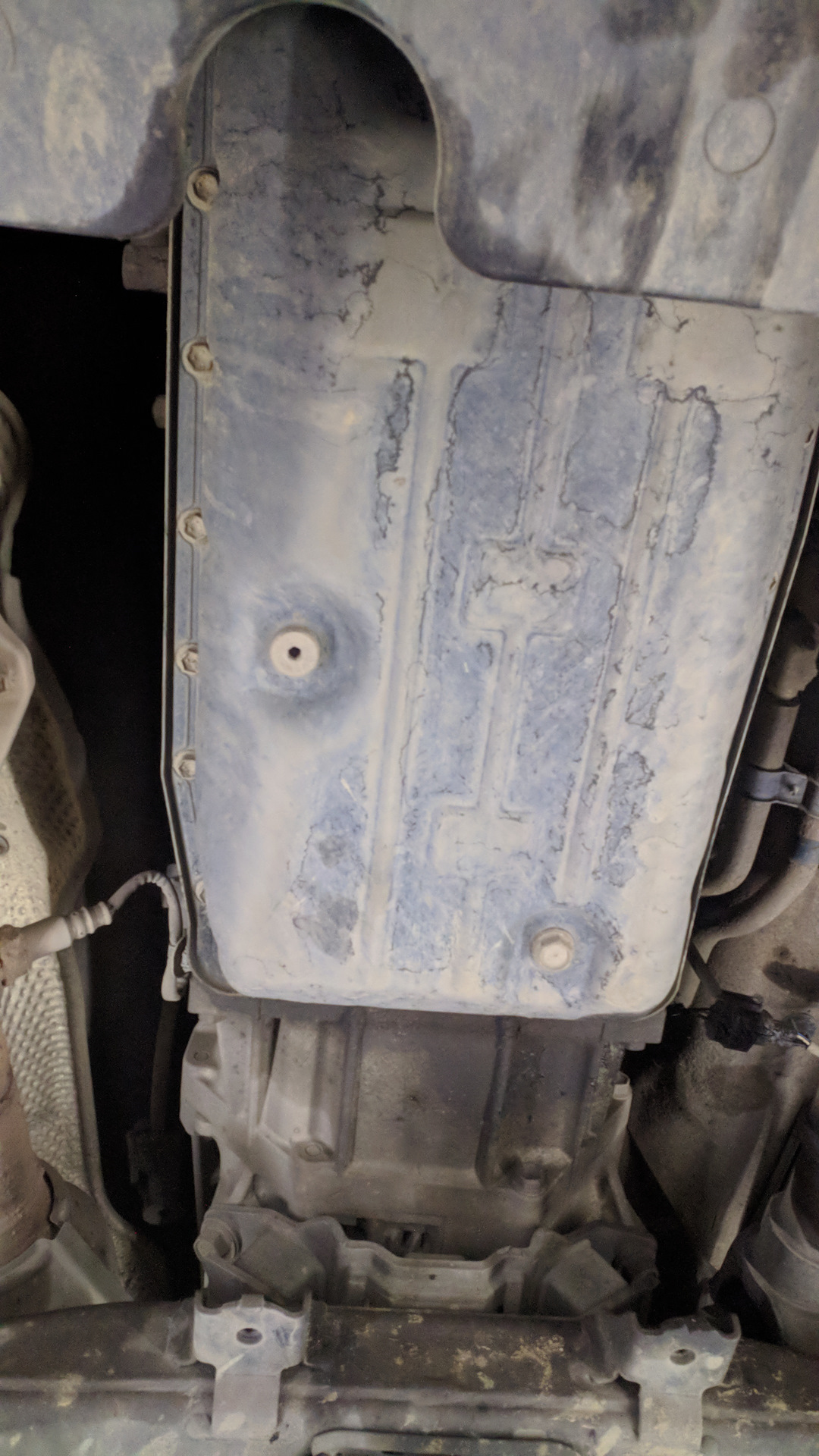 Откручиваем защиту (она перекрывает доступ к болтам поддона)