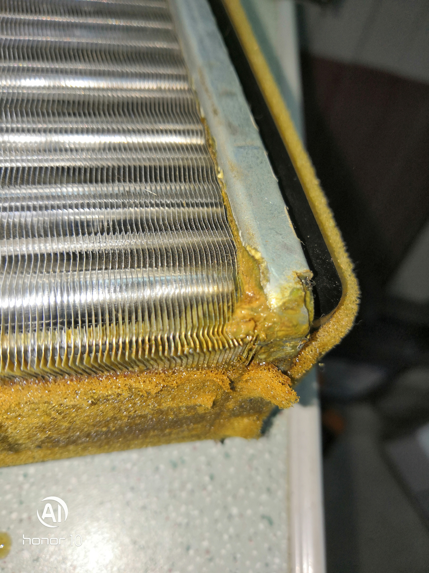Открутил два самореза, которыми прикручен радиатор, выдвинул его, отверткой отогнул зажимы(куда мог дотянуться) которые держат переднюю пластиковую крышку. Поддел отверткой, и с небольшим усилием(в верхней части держат зажимы, их не отогнуть, места мало) снял эту крышку. Дальше нужно подогнуть обратно, то что отверткой отгинали, иначе радиатор не пролезет внутрь. Дальше идем на водительскую сторону и, в моем случае паяльником, вырезаем по контуру выпуклость под радиатор, в корпусе печки. Вырезали? Хорошо… вынимаем радиатор, не забудьте открутить лягушку. Смотрим на него, и видим что он ска… протекал в нижней части с водительской стороны. Выкидываем его нах)))