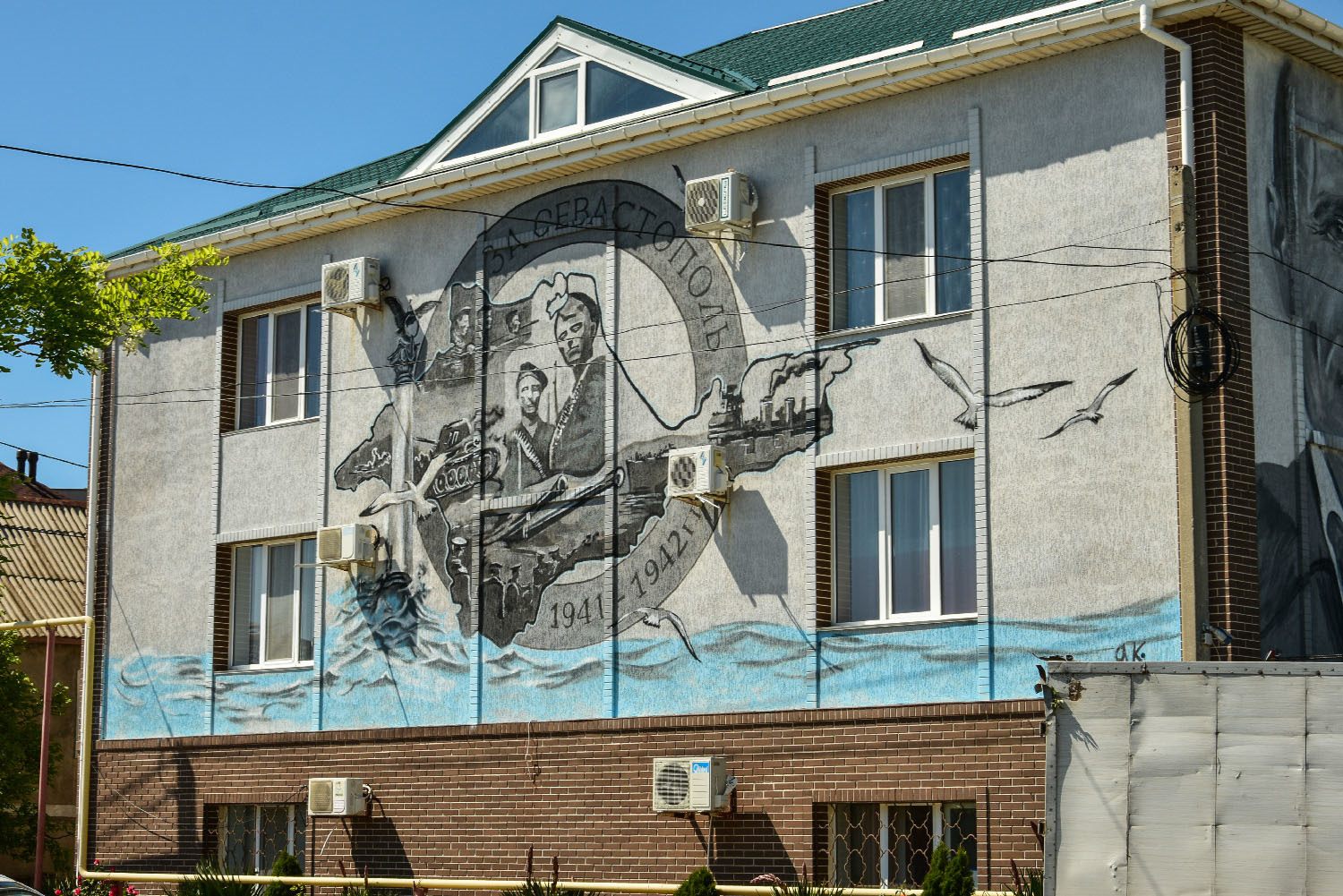 И вот мы у музея 35 батарея. Сразу привлекает внимание графити на стенах кафе с портретом ВВП и защитниками Севастополя.