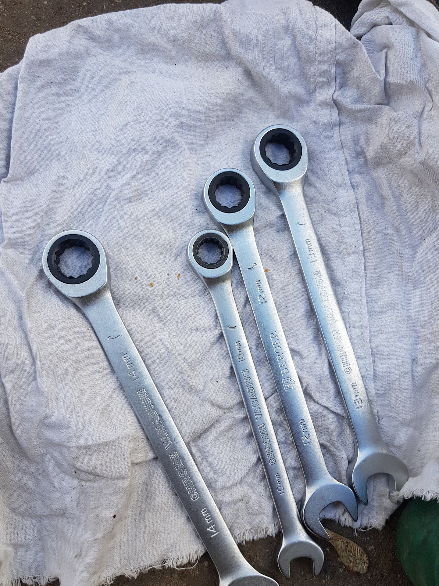 5. Лезем под машину, берем трещотку, кардан, удлинитель и головку на 14 — откручиваем первый болт. крутим до победного, он очень длинный.