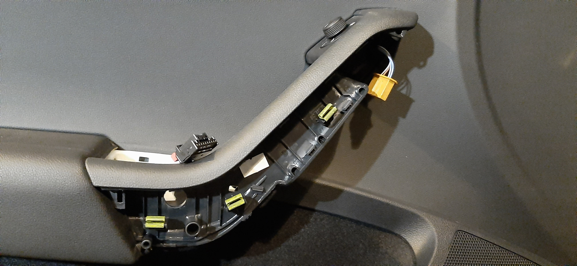 Сложностей добавляет, что на видео указана только разборка водительской двери. И то, без эстетической подсветки. На водительской двери достаточно отщелкнуть разъем кнопок регулировки зеркал для доступа к винту, который держит обшивку двери. На всех остальных дверях вытаскиваем полностью кнопки стеклоподъемника(НЕТ!). Вытаскиваем кнопку из НАКЛАДКИ кнопки стеклоподъемника, чтобы открутить винт, который держит обшивку карты двери. Для рукожопов, по типу меня сразу пишу номера(так как на всех трех накладках я сломал по 2-4 ножки. Левая(5E0 867185C 9B9) и правая (5E0 867186C 9B9) — стоят по 200 рублей. Сняв обшивку двери материмся, у кого есть амбиентная подсветка. Разъем извлекаем очень аккуратно. Защелок непосредственно в них нет. Закреплены очень сильно. Индикация сигнализации как бы "откручивается".