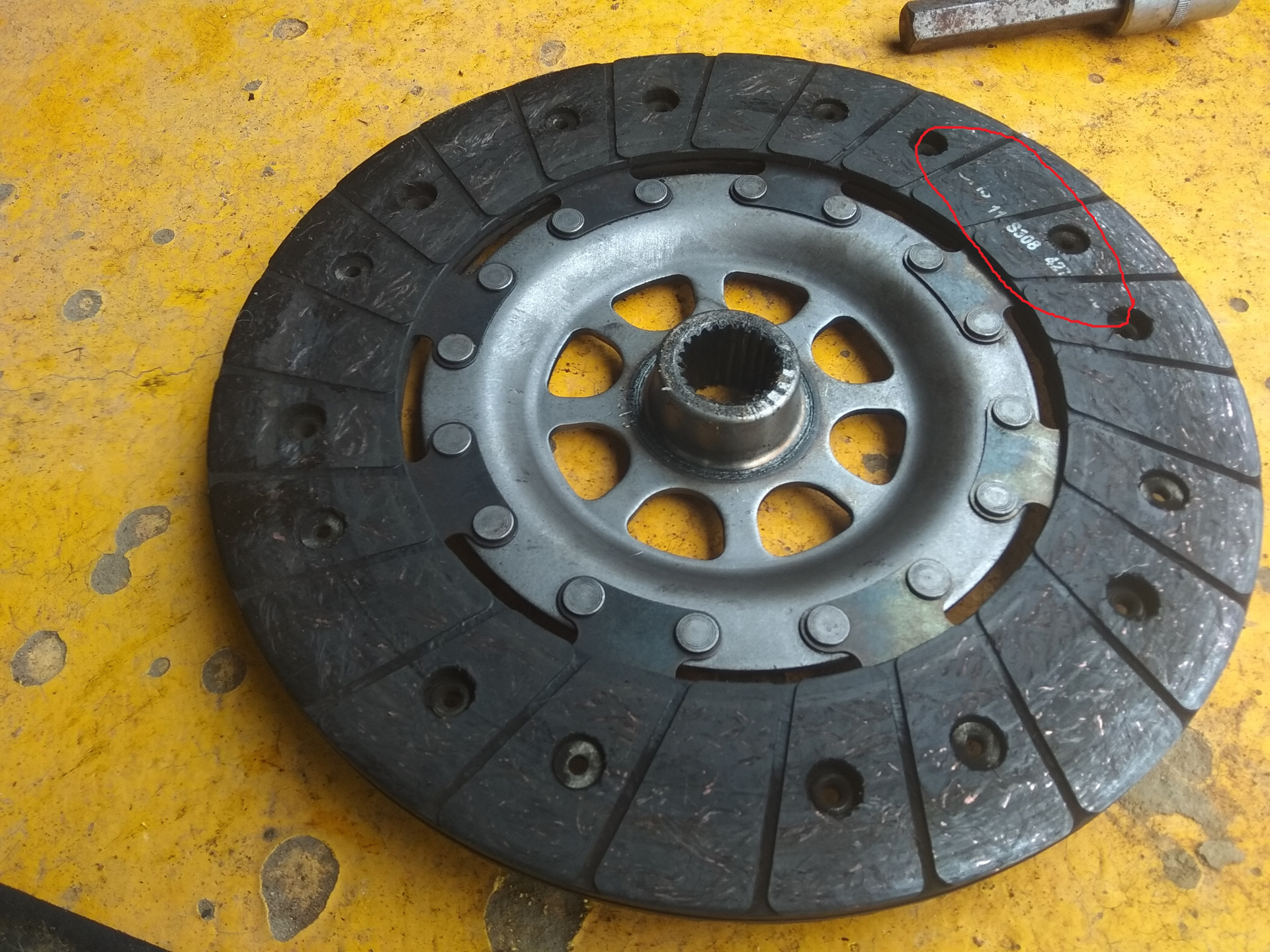 При тщательном осмотре мне не понравился не равномерный износ поверхности прилегающей к маховику. На фото выделил место где даже маркировочная краска не снялась за 1000км. Видно что износ присутствует на внешней части диска. И тут до меня дошло что происходило. В пробках всё сцепления нагревалось и этот диск выгибался становясь как бы как крышка от кастрюли и сцепка с маховиком происходила лишь по крайней части диска, а так как двух-массовый маховик имеет конструкцию как бы буфера рывков оборотов (при бросание сцепления) то пружины маховика из за не плотной сцепки постоянно срывали сцепку что и давала такой звук.
