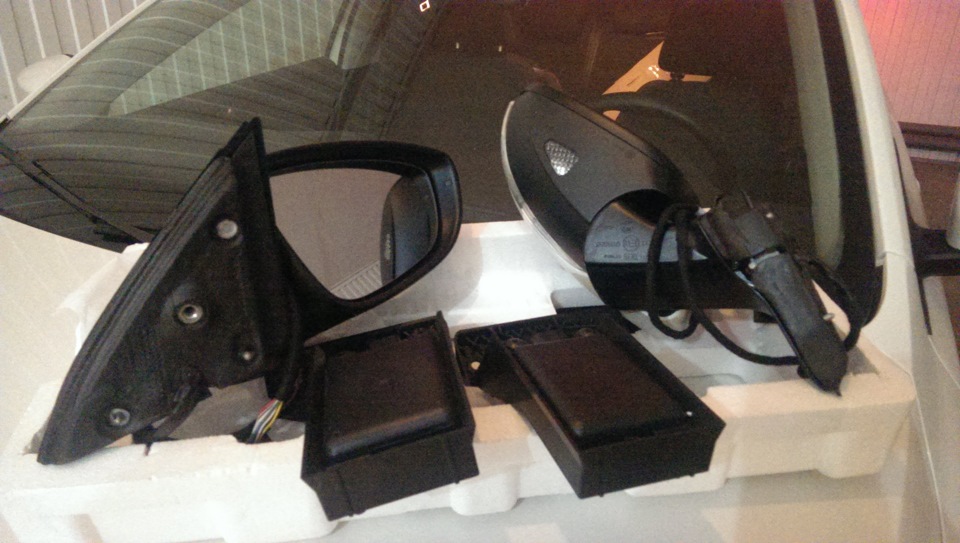 Давно я хотел поставить подсветку околодверного пространства в зеркала, даже купил нужные запчасти §42.1 Подсветка зеркал. (Накладки с отверстием под подсветку), НО сам мечтал о полных зеркалах со сложением и памятью правого зеркала(При включении задней передачи и установки колёсика регулировки на правое зеркало, зеркальный элемент правого зеркала опускается, что бы видеть бордюрный камень и др. предметы, после выключения задней передачи зеркальный элемент встаёт на своё место.) + подсветкой. И поэтому не спешил доводить до логического конца §42. О Side Assist даже и мечтать не думал. Как то ещё в середине 14 года я Михе похвастал, что нашёл на китайском аукционе Side Assist от Passat CC, на что мне Миха сказал, что это дорого и не совсем красиво (в старой системе Side Assist лампочка индикатор находилась в корпусе зеркала) и что бы я не торопился. Ну вот и стал ждать что Миха придумает, и тут после Европейского анонса обновлённой Jetta, стало ясно, Side Assist будет на Jetta. И Миха перед новым годом осчастливил фотографиями зеркал и сенсоров у себя на руках от VW Jetta NEW 2015. Сейчас, для зеркал, ко мне от Михи едут дверные блоки. Ну и буду делать проводку для Сайда сам.