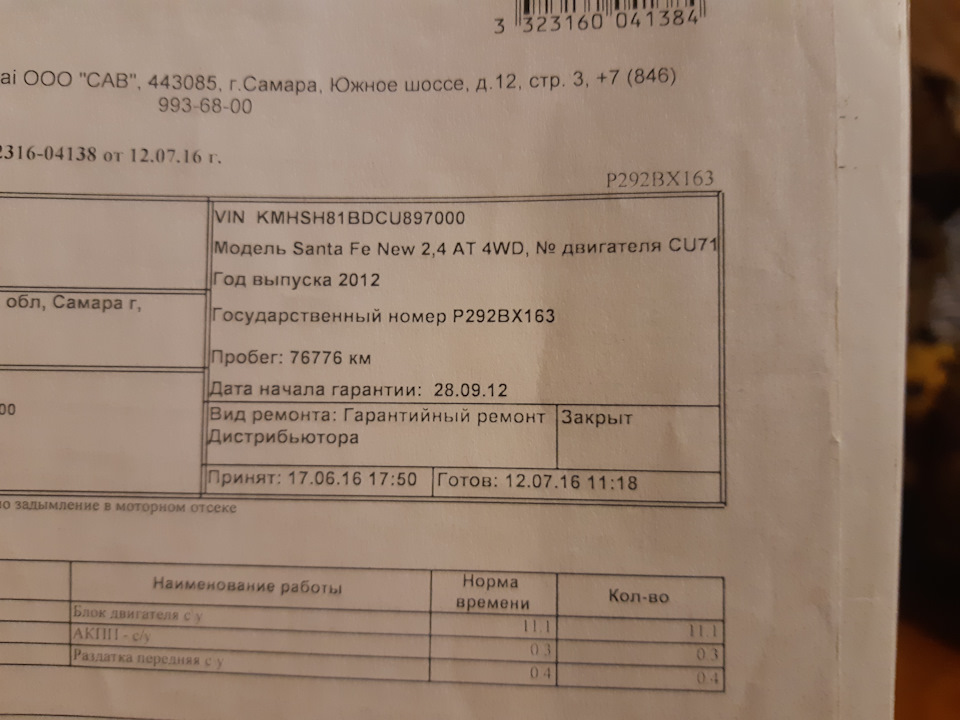 Hyundai Santa Fe 2011, двигатель бензиновый 2.4 л, 173 л. с., полный привод, автоматическая коробка передач — визит на сервис