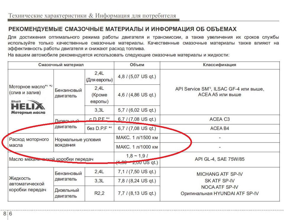 Спасибо, эту страницу из мануала я знаю… Даже внимание обратил на пропущенную строку во второй графе строки РАСХОД МОТОРНОГО МАСЛА… Я позавчера заменял масло — как обычно 0W40 Shell Ultra Helix. Выбираю его не только из рекомендаций завода, но и из за того что легко отличить контрафакт… Уже имел в советское время печальный опыт…
