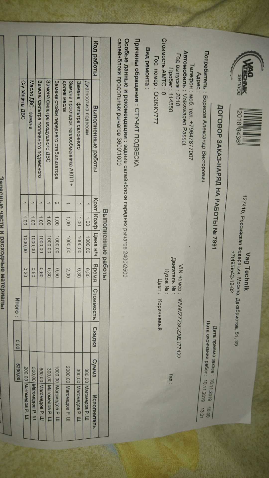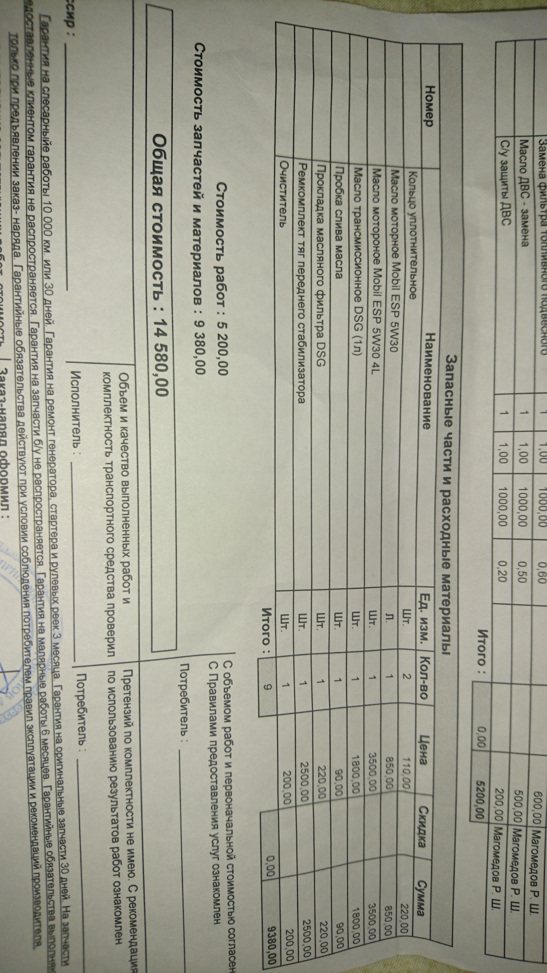Добрый день. Товарищи ВАГоводы. Вот сегодня сделал наконец то Т.О. и полную диагностику. Вобщем нареканий нету. Но к следующему т.о все же нужно поменять кроме масла и саленблоки. И с переди и сзади. Ремонт делал в вагтехник. Вот посмотрите какие цены на работу и масло у них. Фильтра были все мои. Брал КНЕХТ. Male.