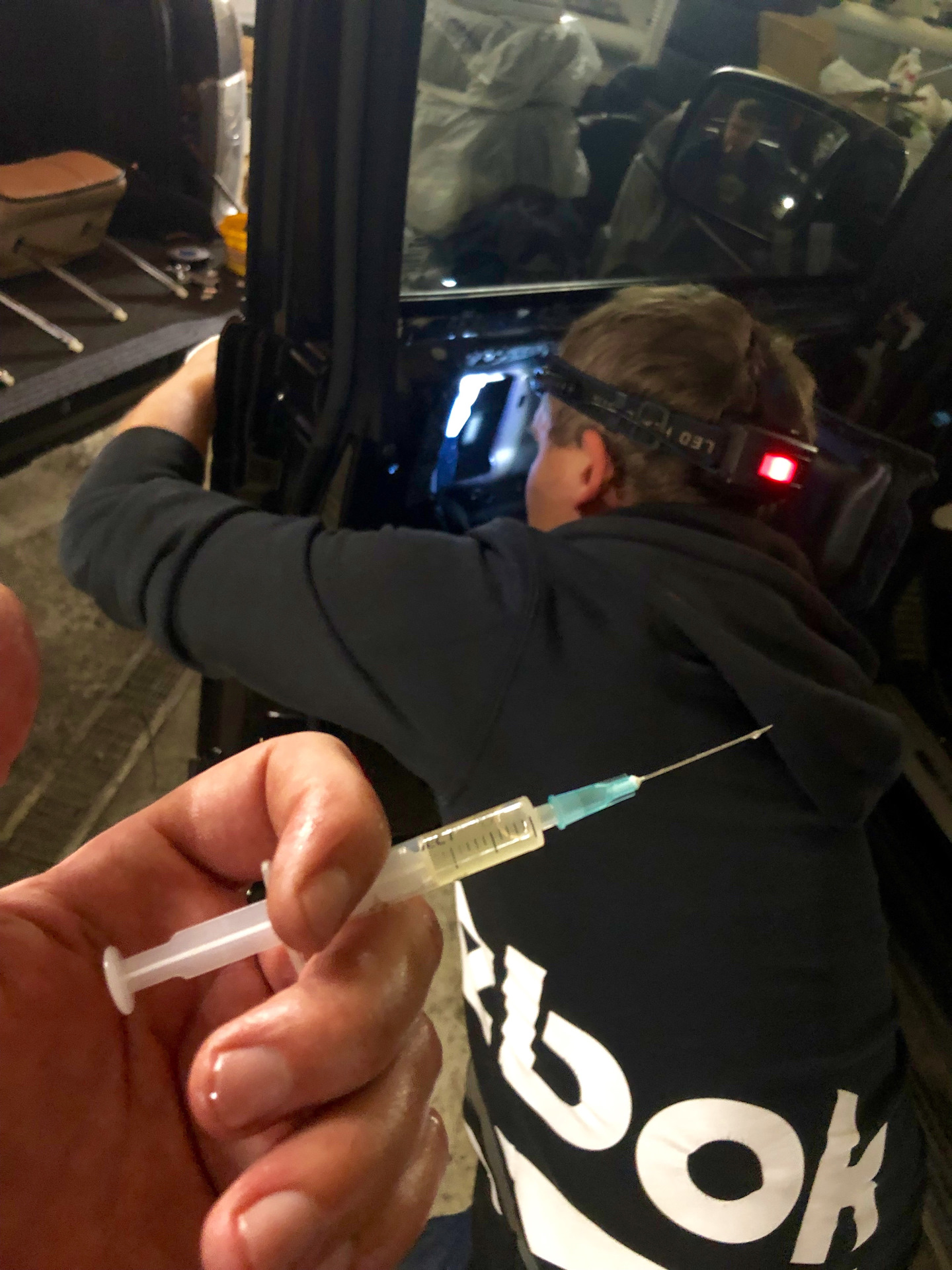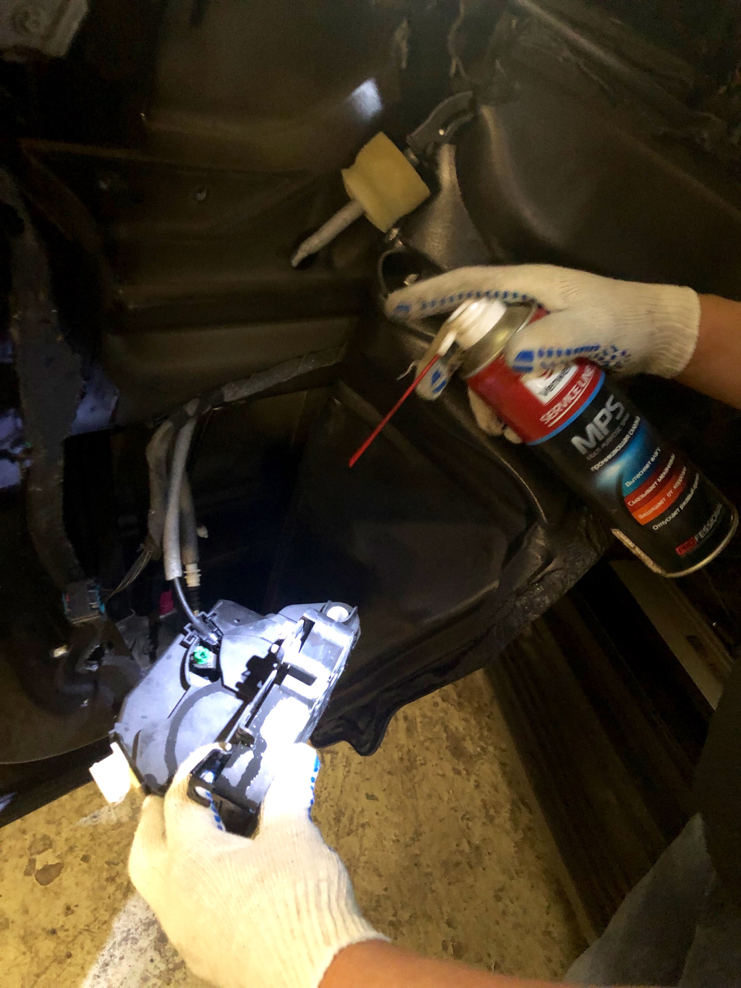 Подобраться к замку не сказать что сложно, снимается достаточно просто (3 болта, скидываем тросик ручки и вынимаем), а вот промазать сам тросик это уже задача, проливал через шприц постоянно двигая тросом в оплетке…