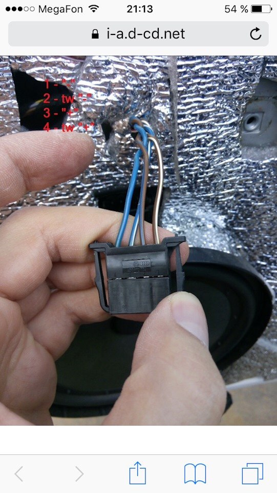 Итак, за два дня была сделана шумка передних дверей и поставлены подиумы для динамиков. Осталось все подключить. Я решил что воткнусь в оригинальные разъемы которые были и не буду ничего штатного резать. Я купил специальные наконечники, которые бы и надевались на динамики и втыкались в штатные места. Припаял эти наконечники к аудиошнуру, все подключил. Заработало!