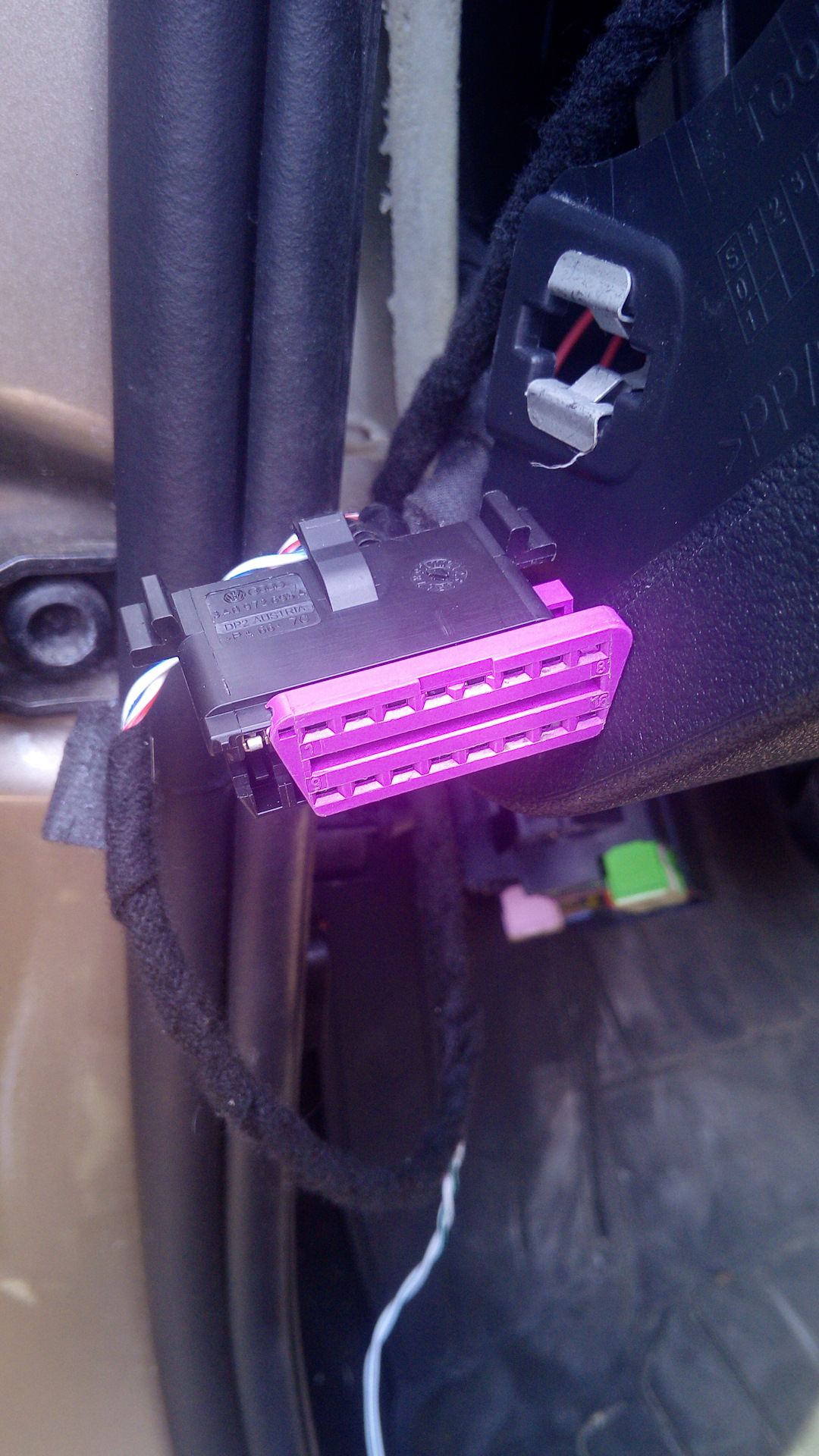 Подключение к разъёму OBD. К разъёму проще подлезть при снятым блоком предохранителей. Разъём крепится на трёх защёлках. Отгибаем защёлки и вытаскиваем разъём внутрь и боковое окно. Там с ним уже удобно работать. Чтобы вытащить из разъёма нужные контакты, надо вытащить фиолетовую вставку, сдвиганием вбок. Затем отжимаем маленький чёрный фиксатор и освобождаем контакт, вытянув его сзади. Можно скрутить провода и не вытаскивая контакты, но мне было удобней их вытащить.
